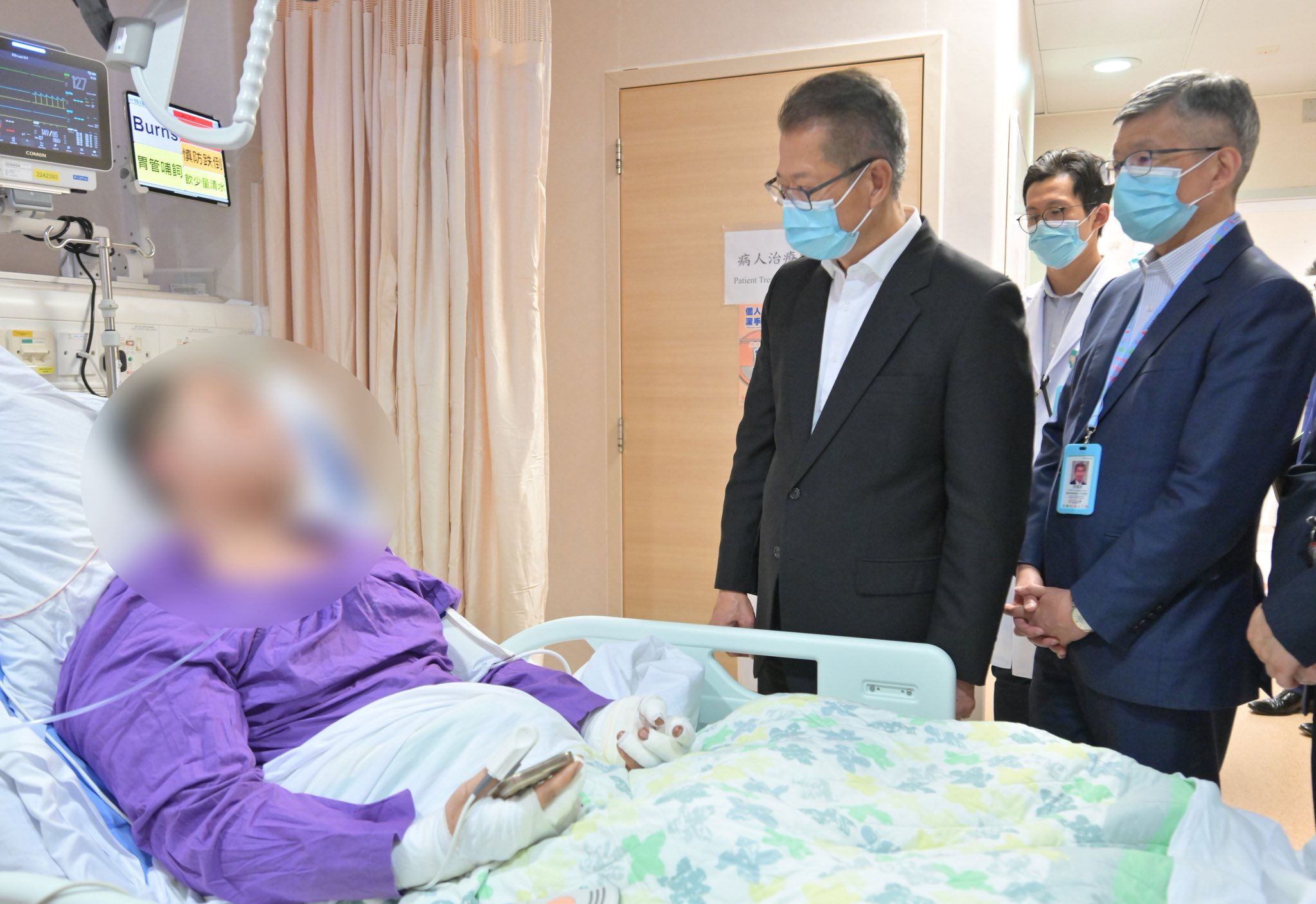 陳茂波今日到沙田威院慰問火災中的傷者,了解他們的康復情況和需要。他提及,傷者也留意到政府的迅速行動,希望透過改革避免事件重演。陳茂波感謝醫護團隊對傷者在身體和心理方面的悉心照料。此外,他亦與火災中不幸遇難的維修工人的家屬會面,了解他們的家庭情況,務求後續的跟進工作能以人性化及具彈性的方式處理,協助他們度過困難。
