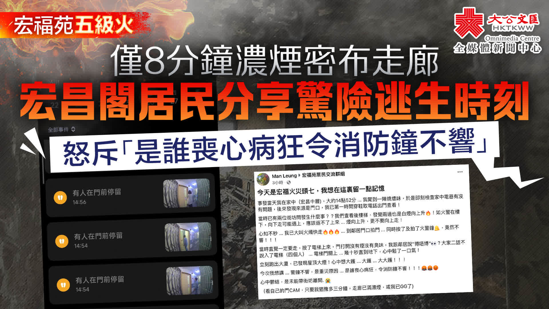 大公文匯全媒體報道,大埔宏福苑11月26日五級火造成嚴重傷亡,消防處經過調查指出,大火期間宏福苑8座大廈的火警鐘全部失效,沒有發出聲響。有自稱住在宏福苑宏昌閣中層的居民在Fb群組「宏福苑居民交流群組」分享火警時大門閉路電視片段紀錄,顯示事發8分鐘內,門口走廊便已經被濃煙充斥,怒斥「是誰喪心病狂,令消防鐘不響!!!」