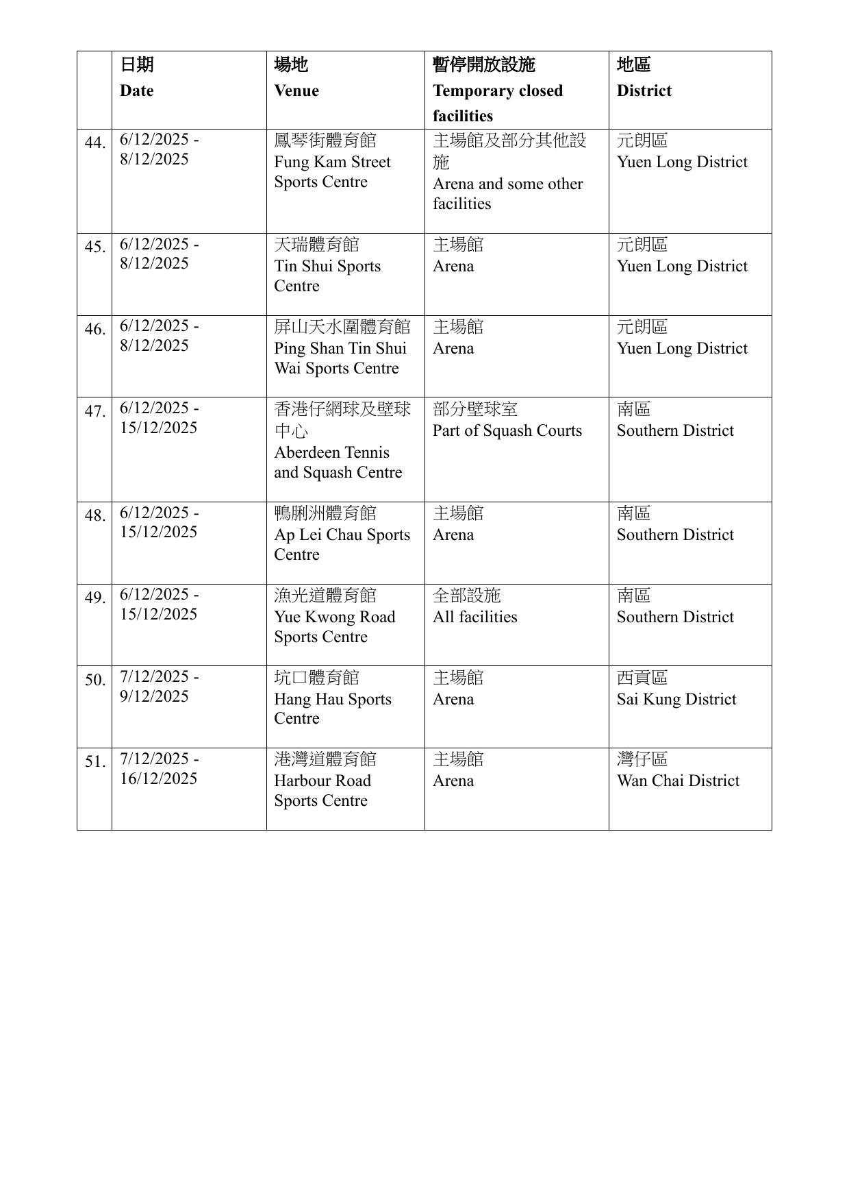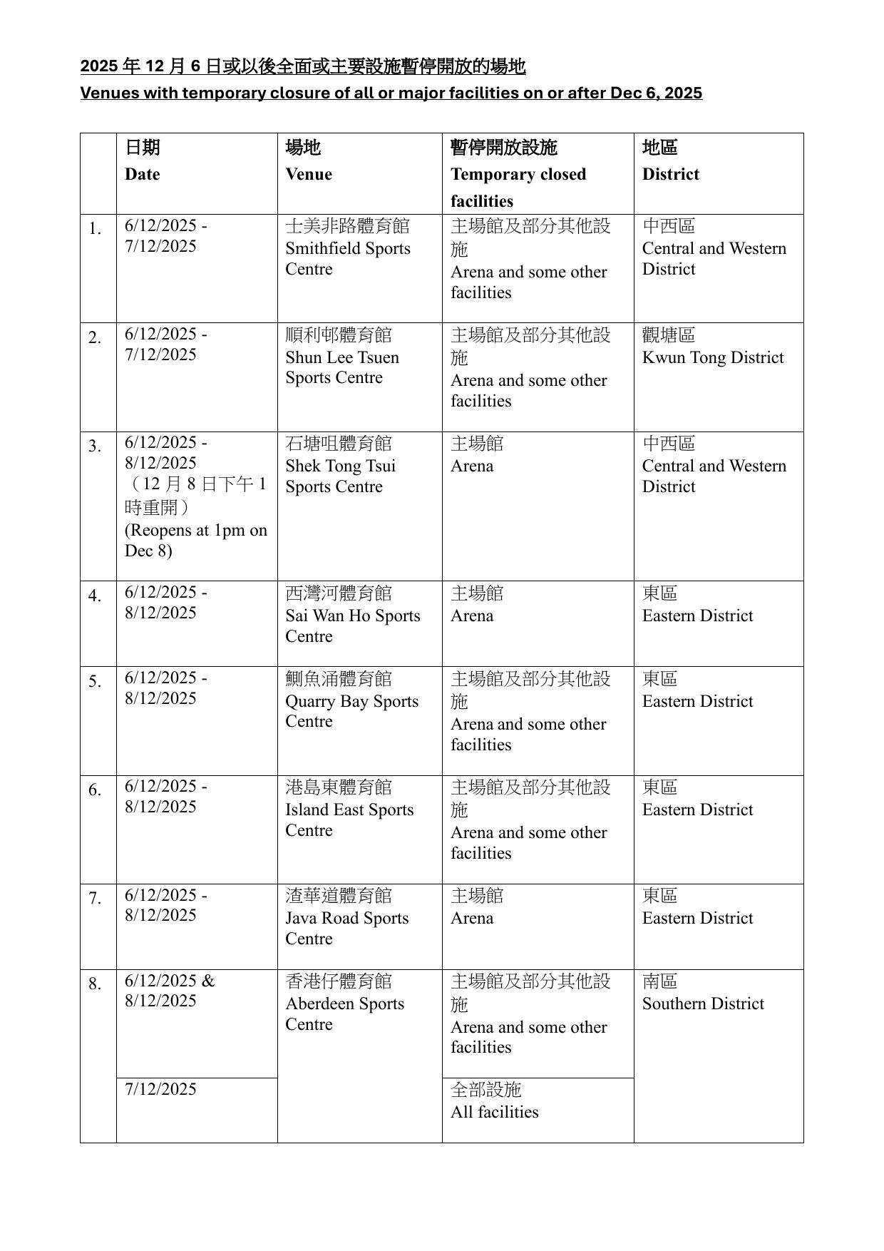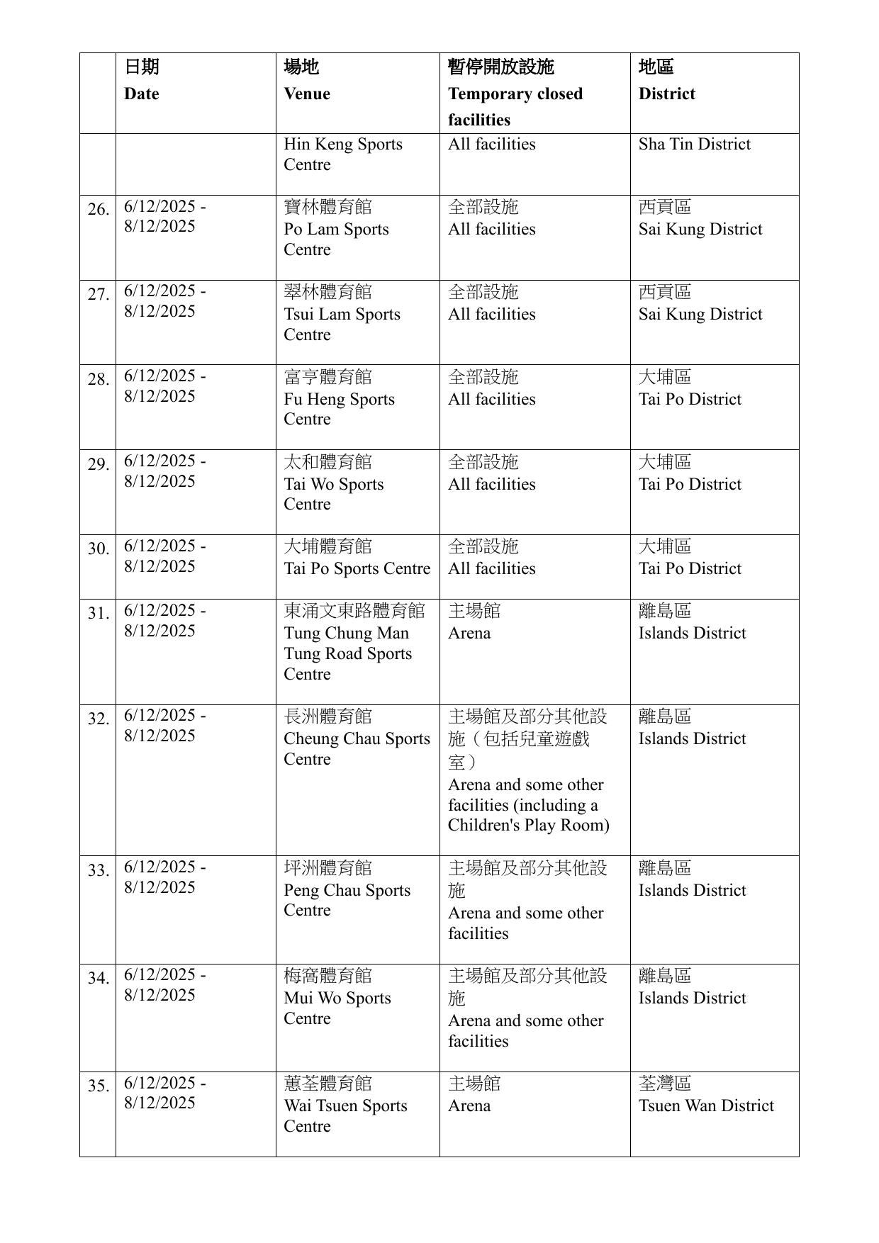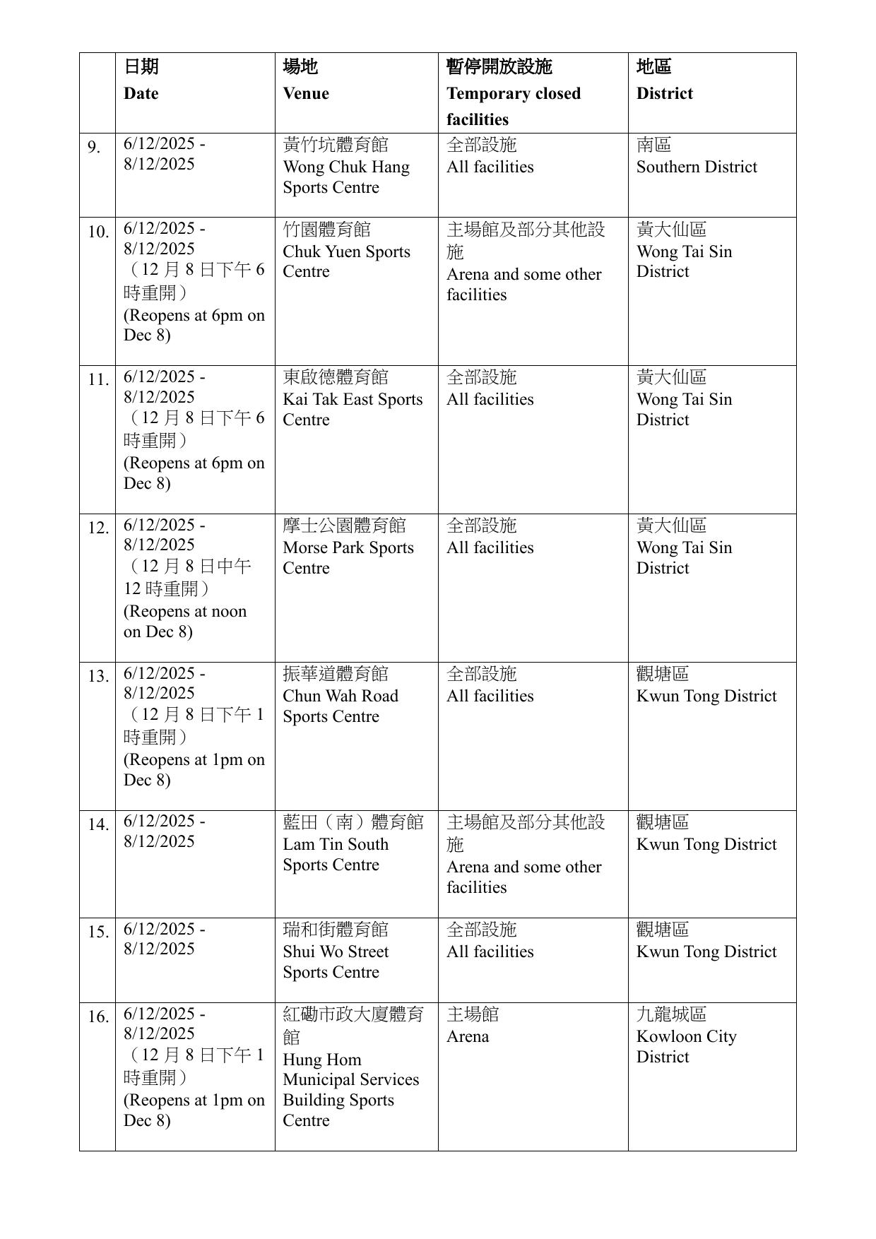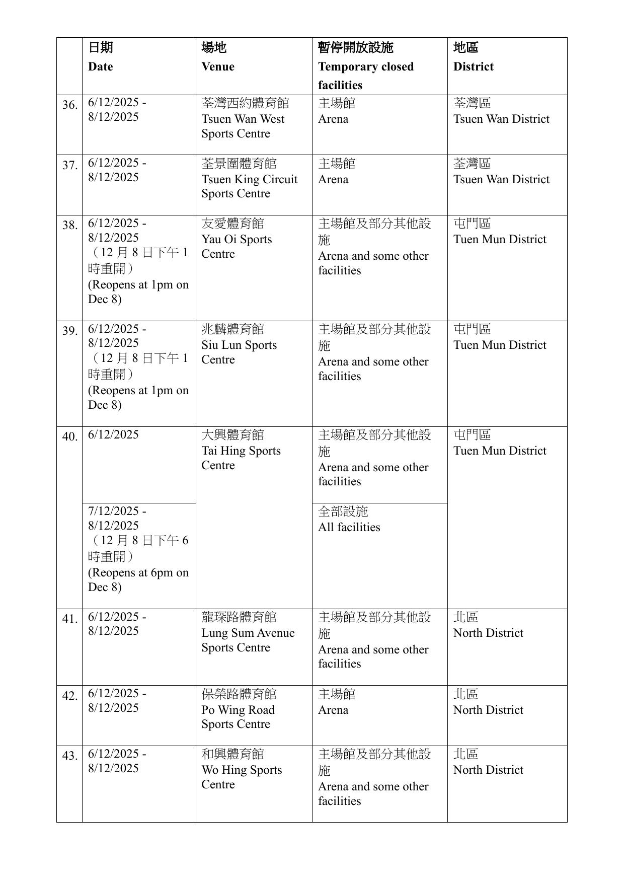康文署指,有關設施暫停開放期間,市民可使用區內其他同類康樂設施。暫停開放日期如因應實際情況需予以調整,會另作公布。而根據康文署資料,大部分設施會在12月6日至8日期間暫時關閉,亦有設施關閉至15至16日。需要暫停開放的設施遍布全港17區,而葵青區則沒有設施受影響。