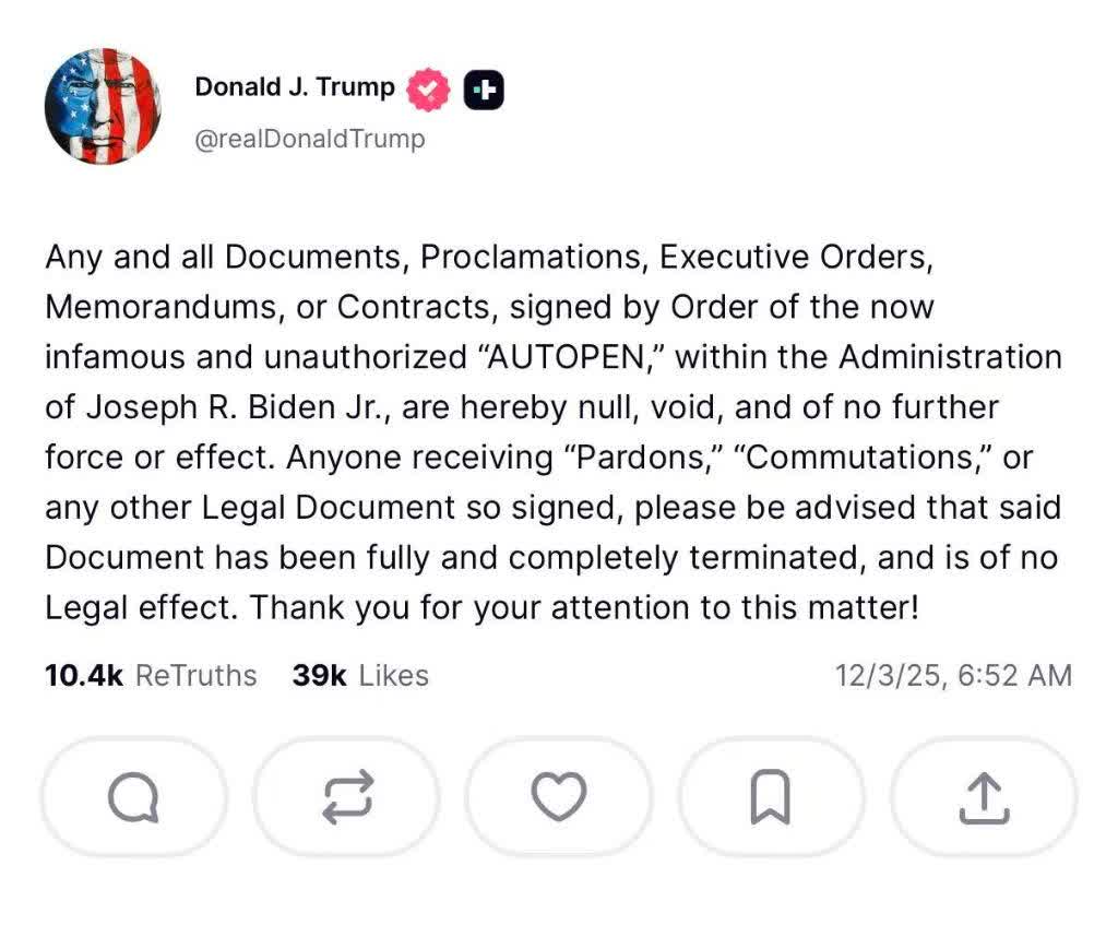 特朗普當天在社交平台「真實社交」上發文說:「任何收到以該方式簽署的『赦免令』『減刑令』或其他任何法律文件的人請注意,上述文件已被完全終止,不具備任何法律效力。」