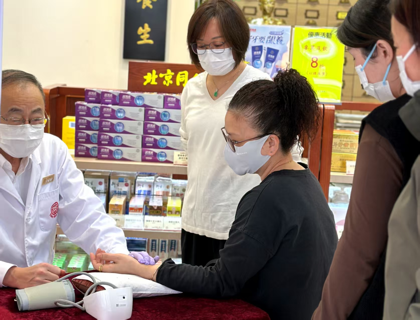 各門店員工同步投入後勤保障,迅速清點清熱解毒類藥品、急救用品、消毒用品等物資,並將治療燙傷、止痛等急救藥擺在顯眼位置。大埔廣福道,屯門,中環,北角等門店外還設立臨時服務點,備足金銀花茶飲和熱水,方便附近的居民和救援人員領取。店員尹寶珍一直在一線服務,期間有一位年逾七旬的老人踉蹌着來到服務點前,原來是老人的降壓藥因緊急撤離忘記攜帶,此刻頭暈難耐。尹寶珍立刻扶她坐下測血壓並耐心安慰:「阿婆您可能有些緊張,放寬心,血壓就會降下來……」她一邊安撫老人情緒,一邊快速取來降壓藥和溫水。老人服藥後,情緒漸漸平穩,攥着尹寶珍的手,一個勁兒地道謝。