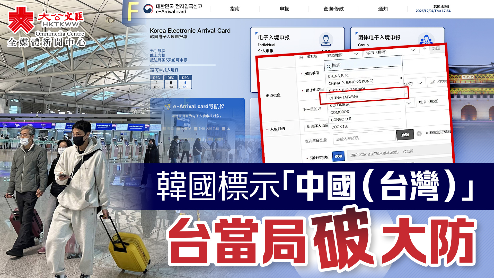 據參考消息援引台媒12月3日報道,韓國的電子入境卡申報系統中,將台灣標示為「中國(台灣)」。台當局外事部門3日回應表示,台當局所謂「駐韓國代表處」已提出嚴正關切並交涉,但至今未獲韓方正面回應。