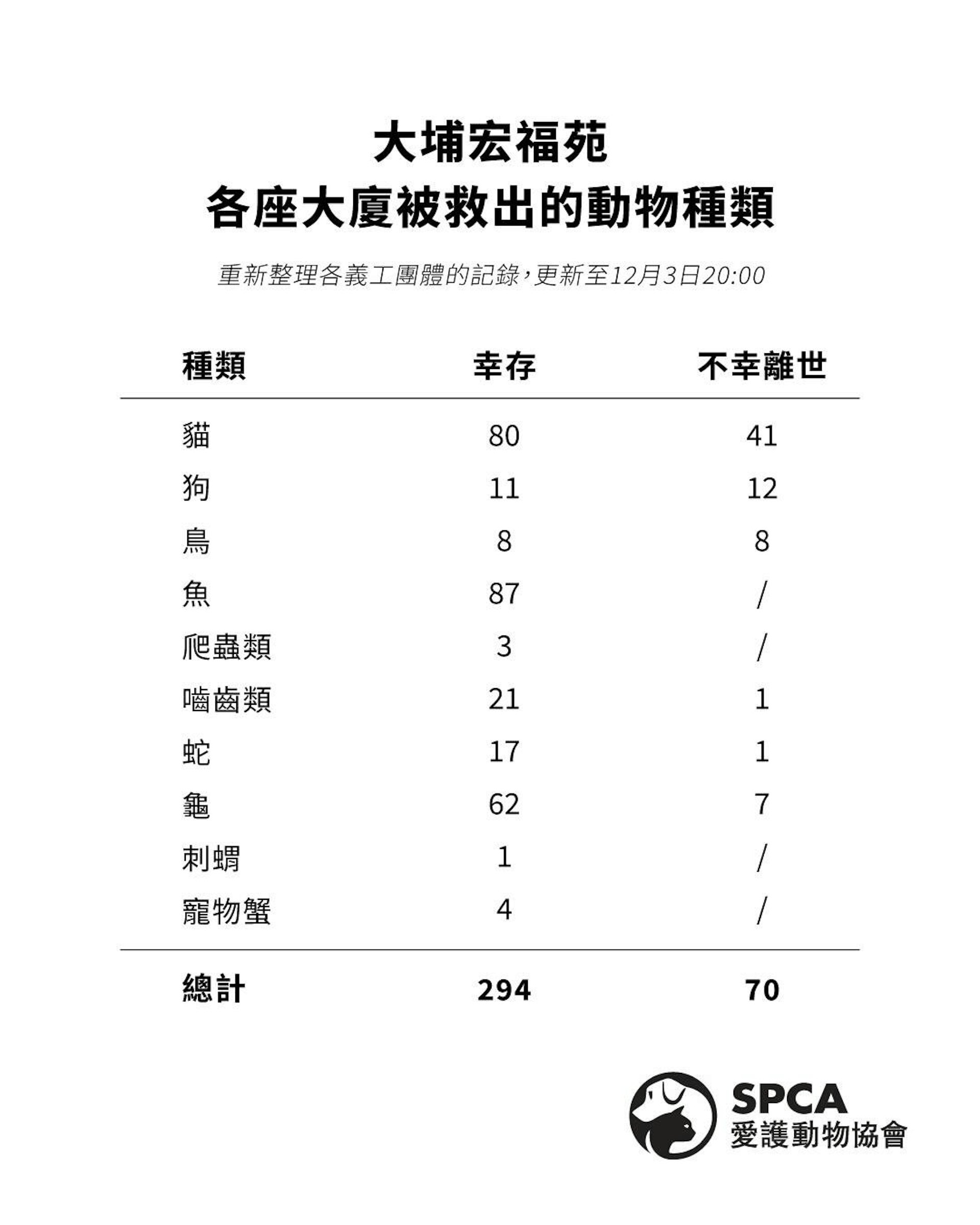 截至3日晚上8時,愛協公布,自火災以來共尋獲364隻動物,其中294隻倖存,70隻已不幸離世。仍有173隻動物下落不明,估計整體受影響的動物總數超過537隻。過去兩天救出魚類、寵物蟹,及一隻已離世的貓。