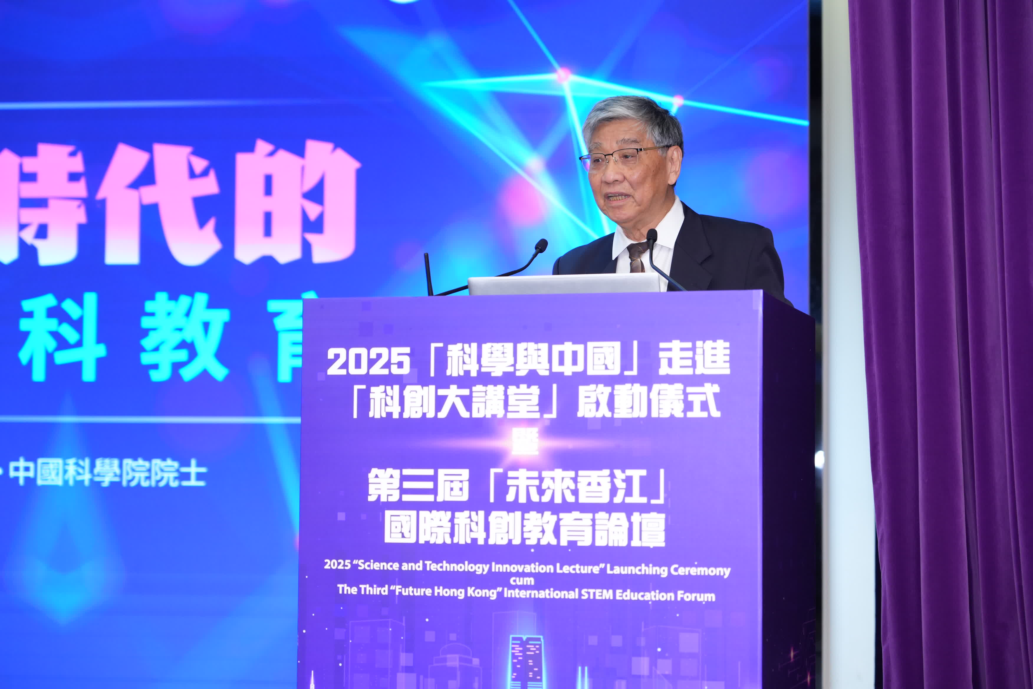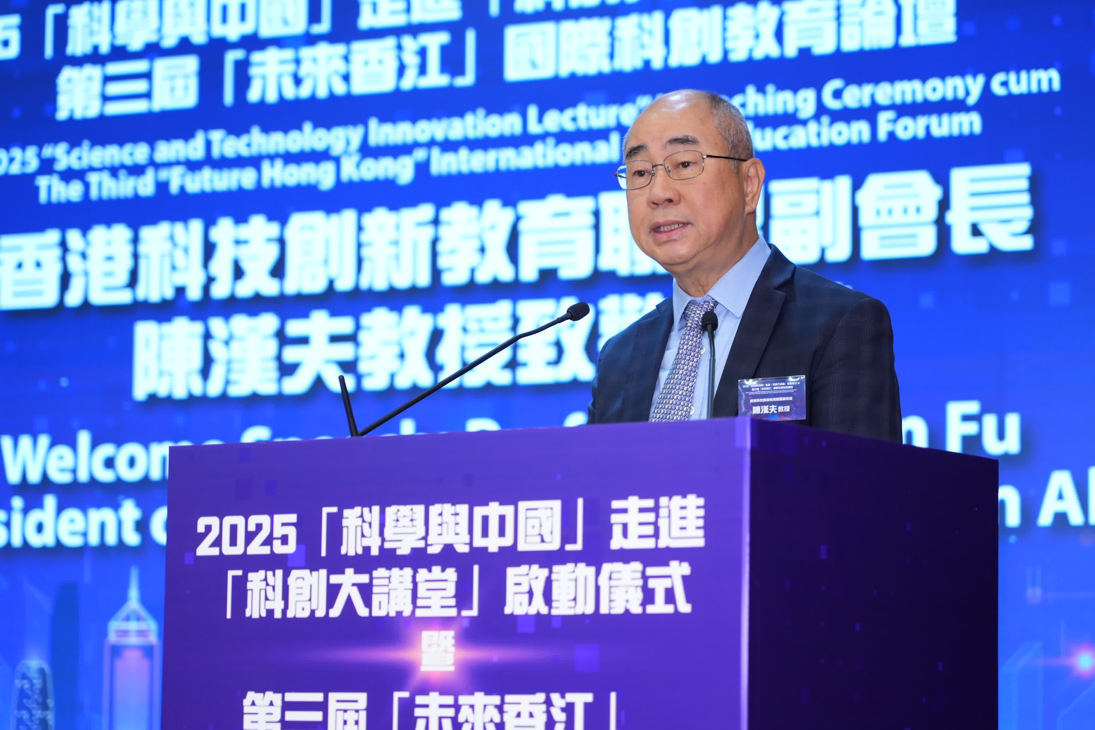 香港科技創新教育聯盟副會長陳漢夫教授致歡迎辭表示,是年乃第七年舉辦「科創大講堂」,本年邀請13位中國科學院院士專家來港,走入香港中小學進行科普講座,課題涵蓋天文、化學、生物學等領域,增進學生對科學的興趣。陳漢夫亦指,同期舉辦的第三屆「未來香江」國際科創教育論壇,是加深教師與學界聯繫的重要平台。是年論壇以「AI未來與教育」為主題,設置上午主題演講與下午專題論壇兩大環節,為教師與學者搭建互動平台,推動學界展開深入交流與分享。