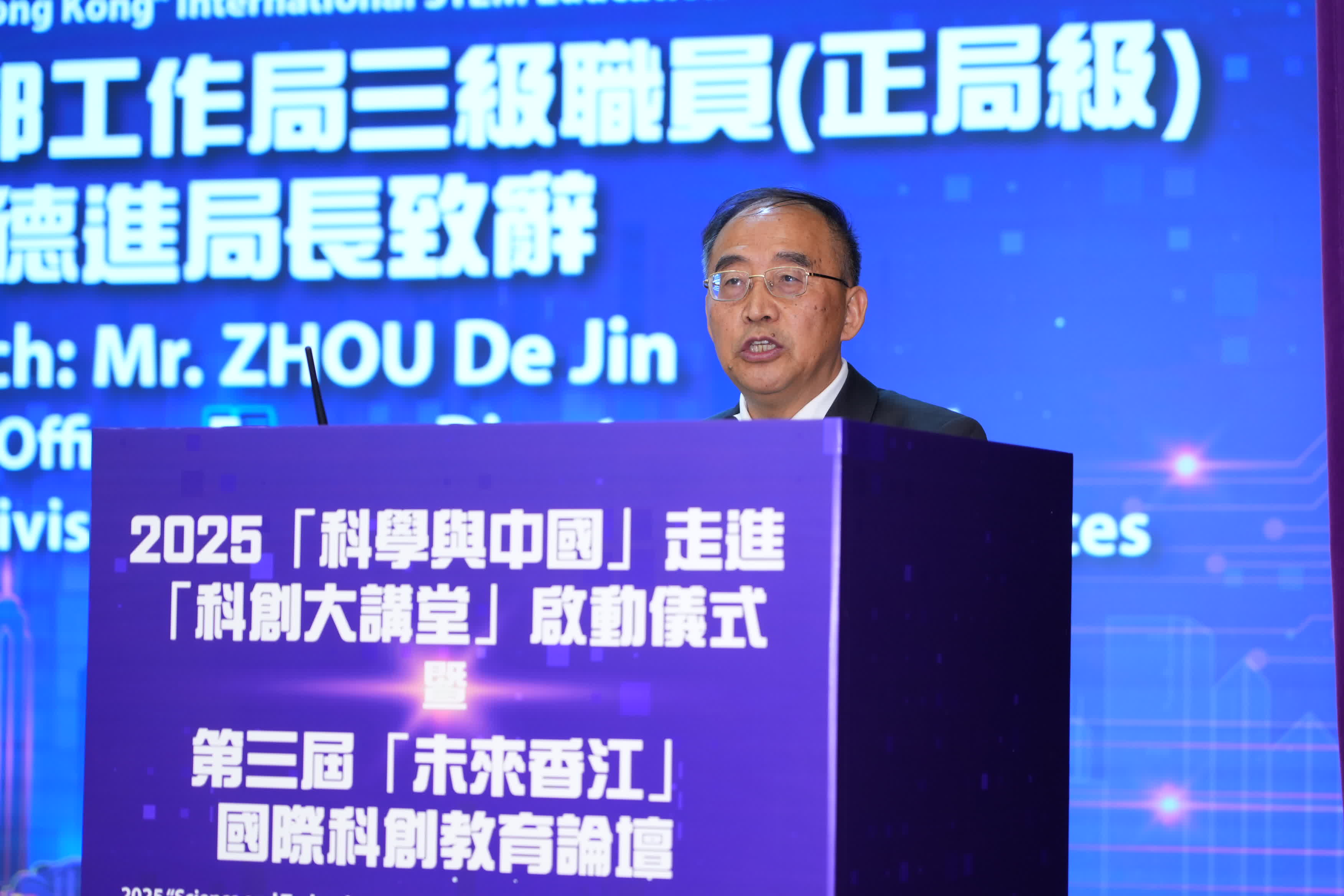 中國科學院學部工作局三級職員(正局級)周德進局長致辭表示,自2019年起,中國科學院與香港中聯辦攜手,將「科學與中國」帶進香港「科創大講堂」,迄今已有90餘位院士專家通過線上線下方式,走進香港160餘所中小學。香港推動全港小學開設「科學科」,持續加強科學教育,中國科學院邀請了13位來自不同領域的院士專家參與此次活動,旨在促進香港青少年對祖國科技發展的了解,激發青少年對科學的好奇心和探索欲。