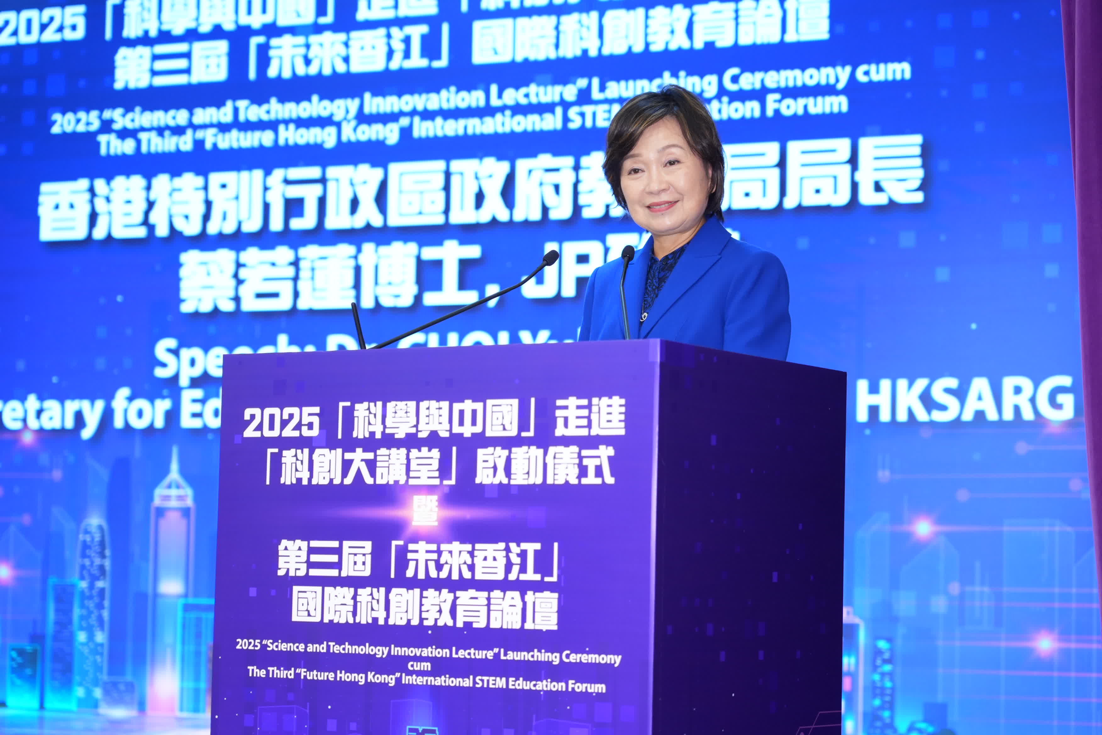 香港特別行政區政府教育局局長蔡若蓮博士致辭表示,隨着全球數字化轉型,數字教育已成為提升競爭力和培養人才的關鍵因素。蔡若蓮局長指,為配合國家科教興國的戰略,2025年施政報告提出將於2026年發表中小學數字教育藍圖,包括優化中小學銜接的資訊和創科教育課程、訂定「人工智能(AI)素養」學習架構、將AI教育納入核心課程、加強教師AI培訓、引入企業資源等,為香港發展成國際創新科技中心提供人才支撐。