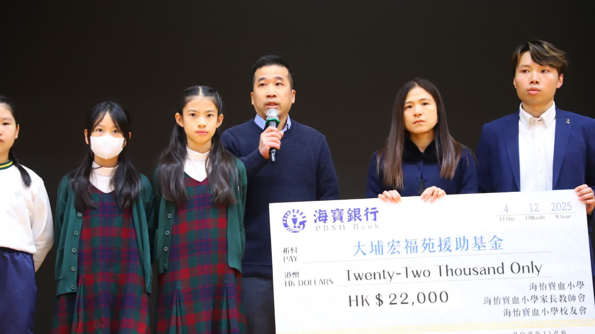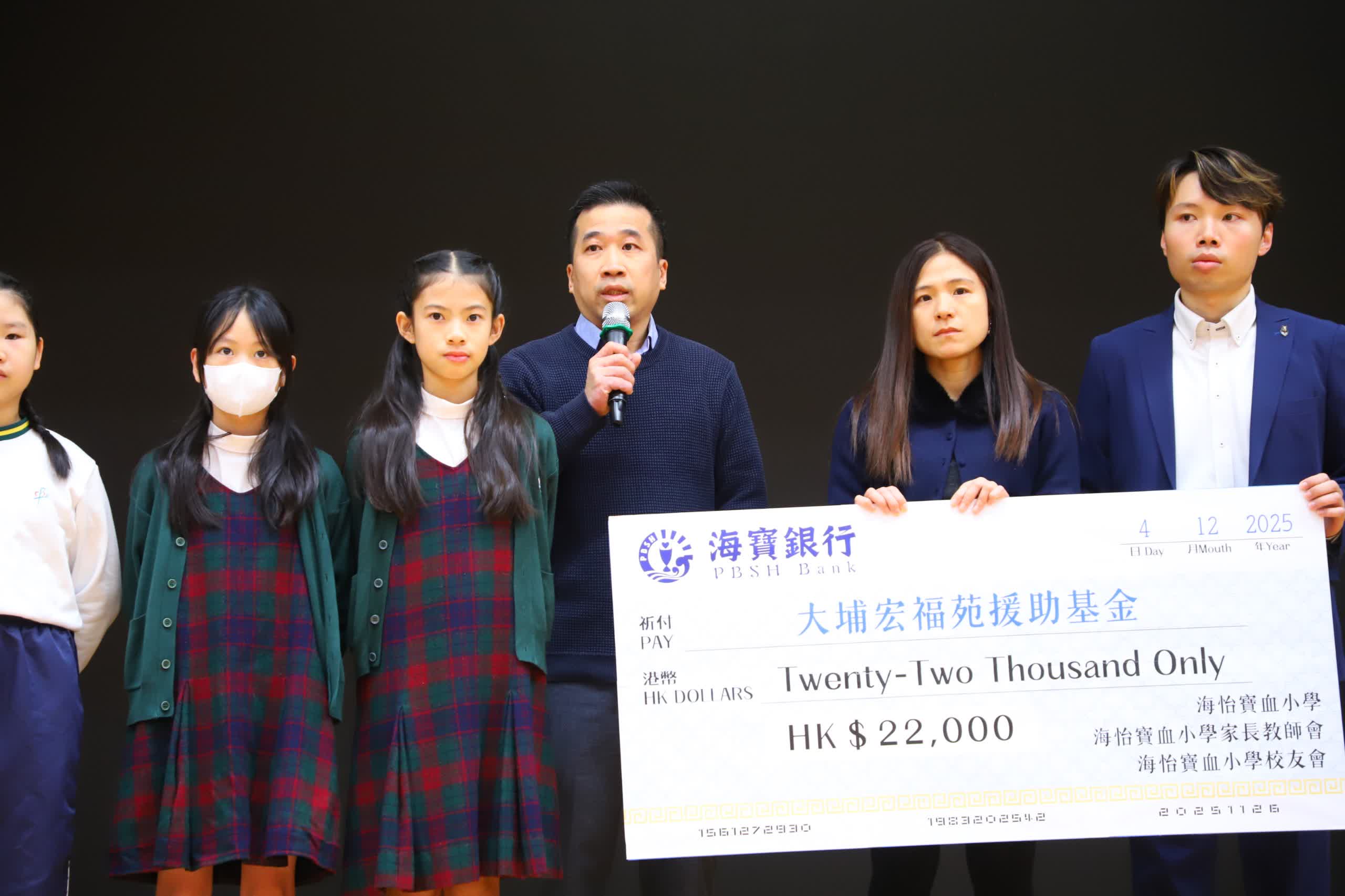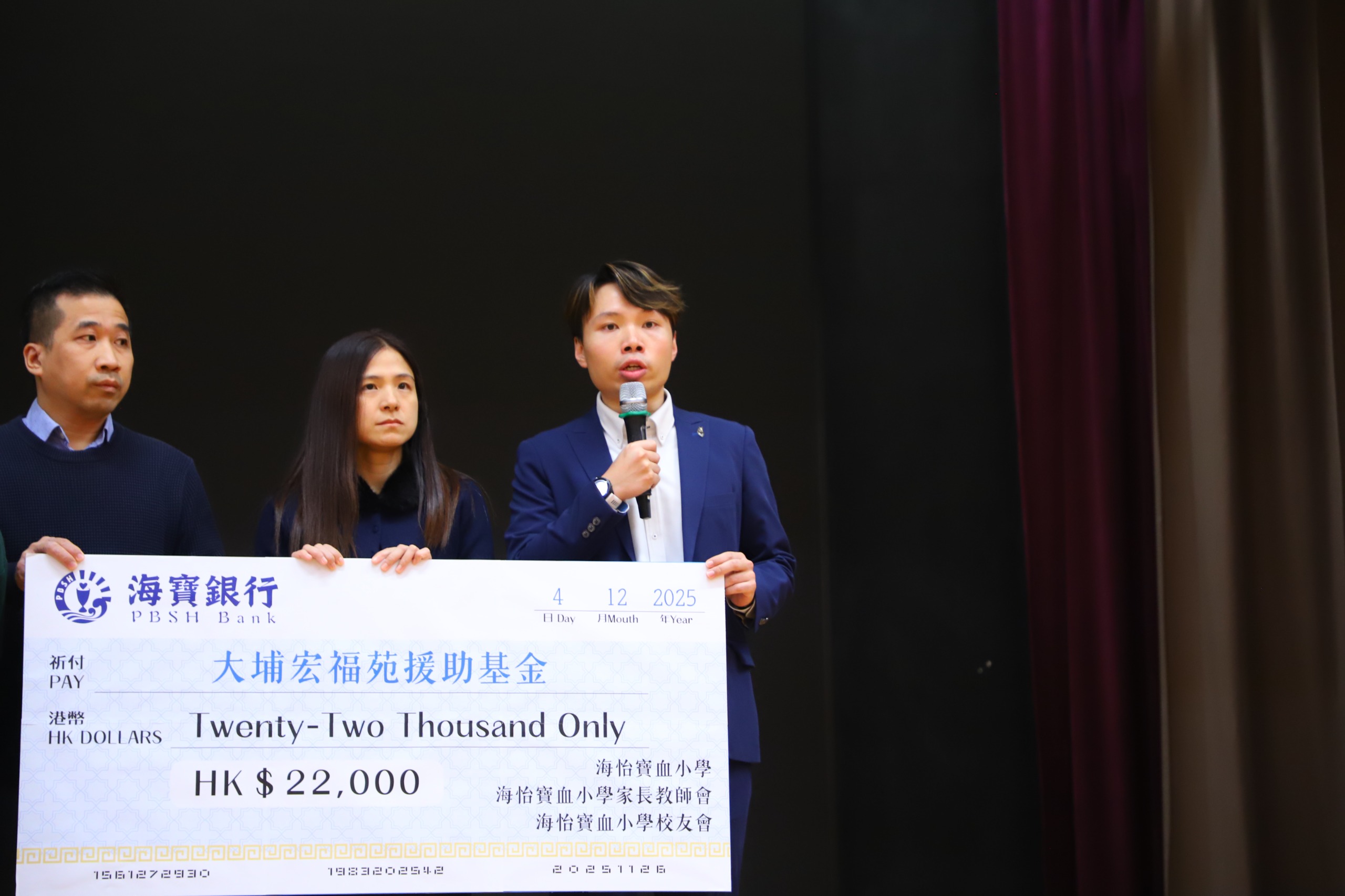 為引導學生以行動關懷社會,學校於12月4日早會舉行支票捐贈儀式,由校長林淑操女士、家長教師會主席陳家麒先生及校友會主席劉卓宏先生共同主持。校方向全體學生致辭,勉勵大家關懷他人、發揮互助精神。陳主席鼓勵同學培養同理心,了解社會需要,並以具體行動幫助他人;劉主席則指出,取消晚宴不僅是活動調整,更展現學校對社會責任與友愛的堅持。