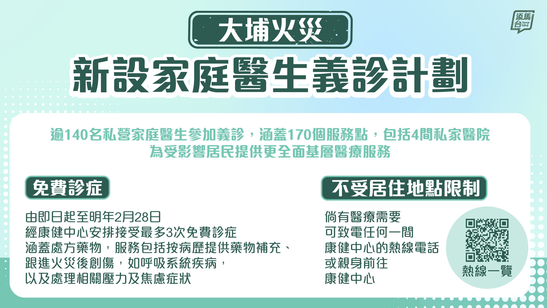 有意參加義診計劃的家庭醫生,可透過電郵(phcc@healthbureau.gov.hk)聯絡基層醫療署。基層醫療署亦正透過醫務衞生局中醫藥處統籌中醫義診服務,詳情稍後公布。了解更多: https://bit.ly/4oRKEfD地區康健中心/站熱線:https://bit.ly/4rziOXS 大埔宏福苑支援服務一站式專題網站: www.taipofire.gov.hk