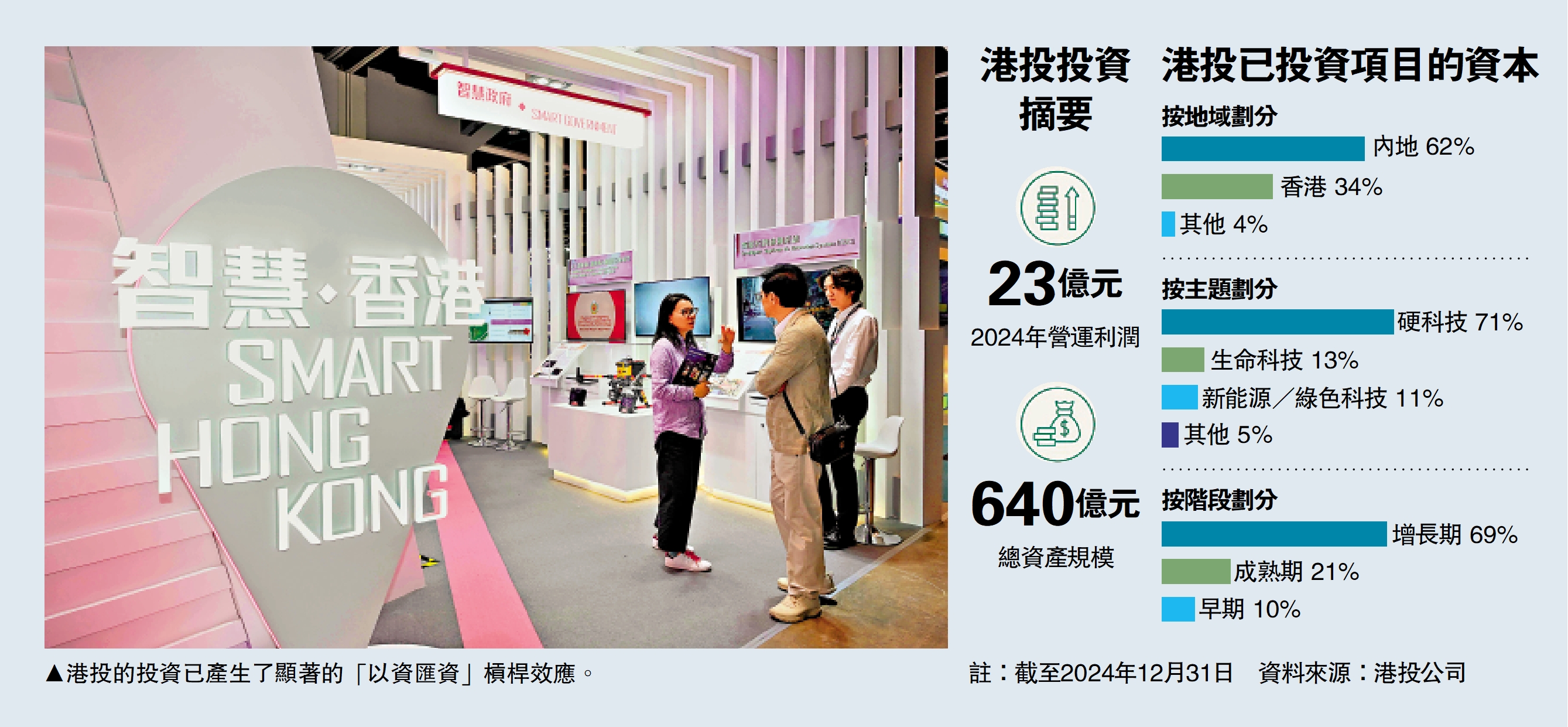 根據年報,截至2024年年底,港投公司資產總額為640.07億元,年度營運利潤22.52億元,主要來自23.45億元的投資收入。投資已產生了顯著的「以資匯資」槓桿效應。報告指出,港投公司每投入1元,便能帶動超過6元的市場長期資金共同投資,顯示作為催化劑的角色獲得市場認可。