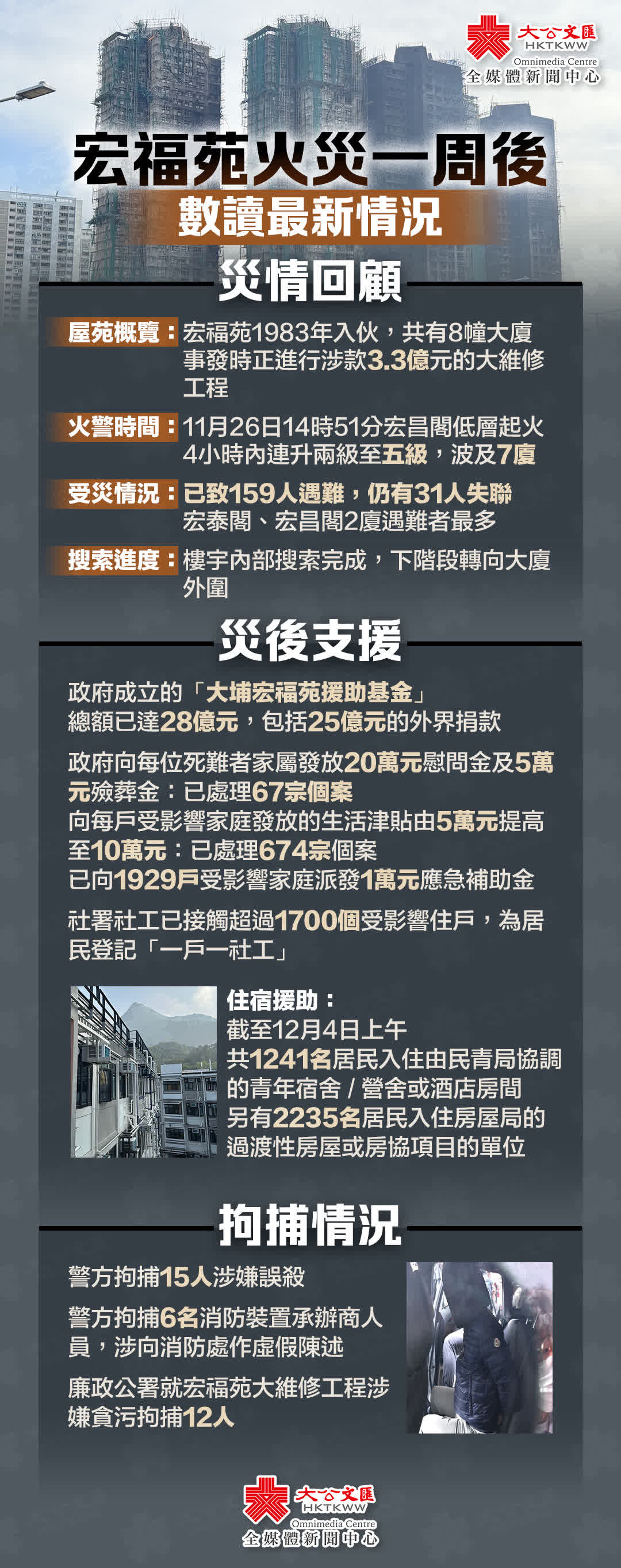 (大公文匯全媒體 記者 舒城)大埔宏福苑11月26日下午2時51分發生火警,火勢猛烈,下午3時02分升為三級,下午3時34分升為四級,並於下午6時22分升為五級。火災已致159人遇難,仍有31人失聯。宏福苑8座大廈中僅宏志閣未受大火波及,其餘7座大廈中,宏泰閣、宏昌閣兩廈遇難者最多。大公文匯全媒體梳理火災一周後最新情況,一圖回顧災情、災後支援及拘捕情況等信息。