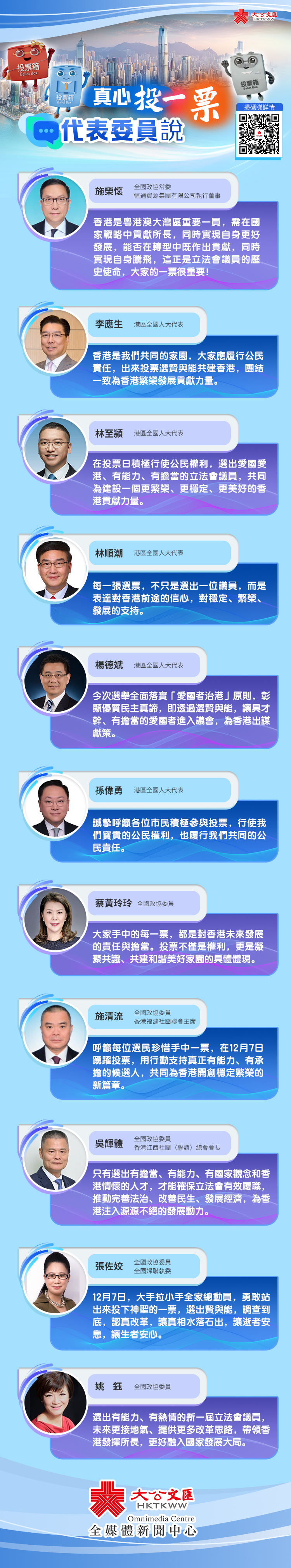 「12月7日踴躍投票!約定您!」第八屆立法會選舉氣氛愈來愈熱。有港區全國政協委員、人大代表表示,選舉有賴市民攜手選賢任能,呼籲全港市民盡公民責任,一起為香港未來投下神聖一票,選出優秀代表進入議會為香港更好發展建言獻策,與特區政府共同帶領香港融入國家發展大局。