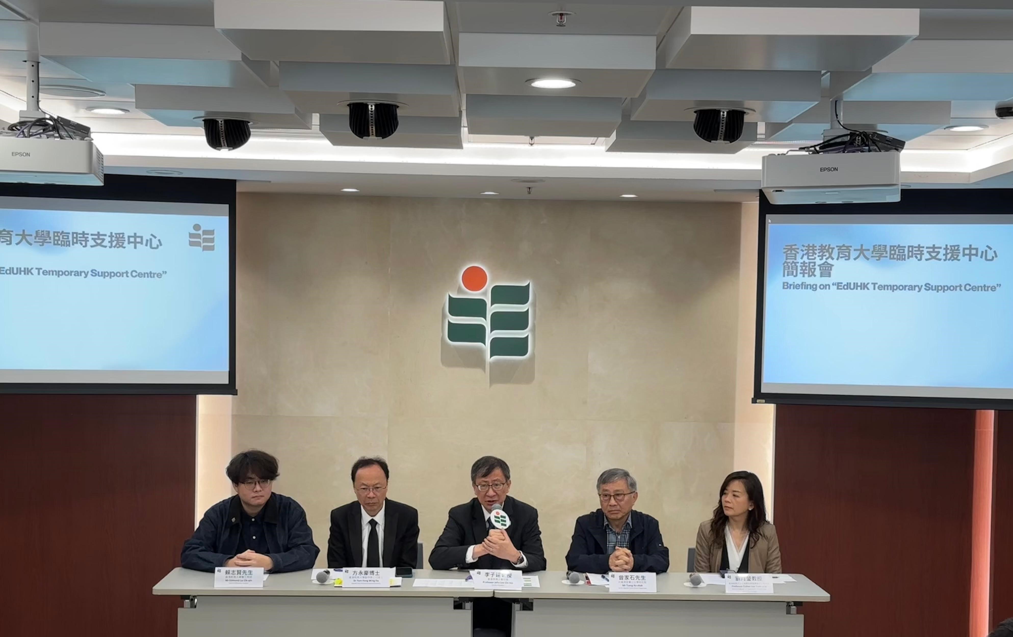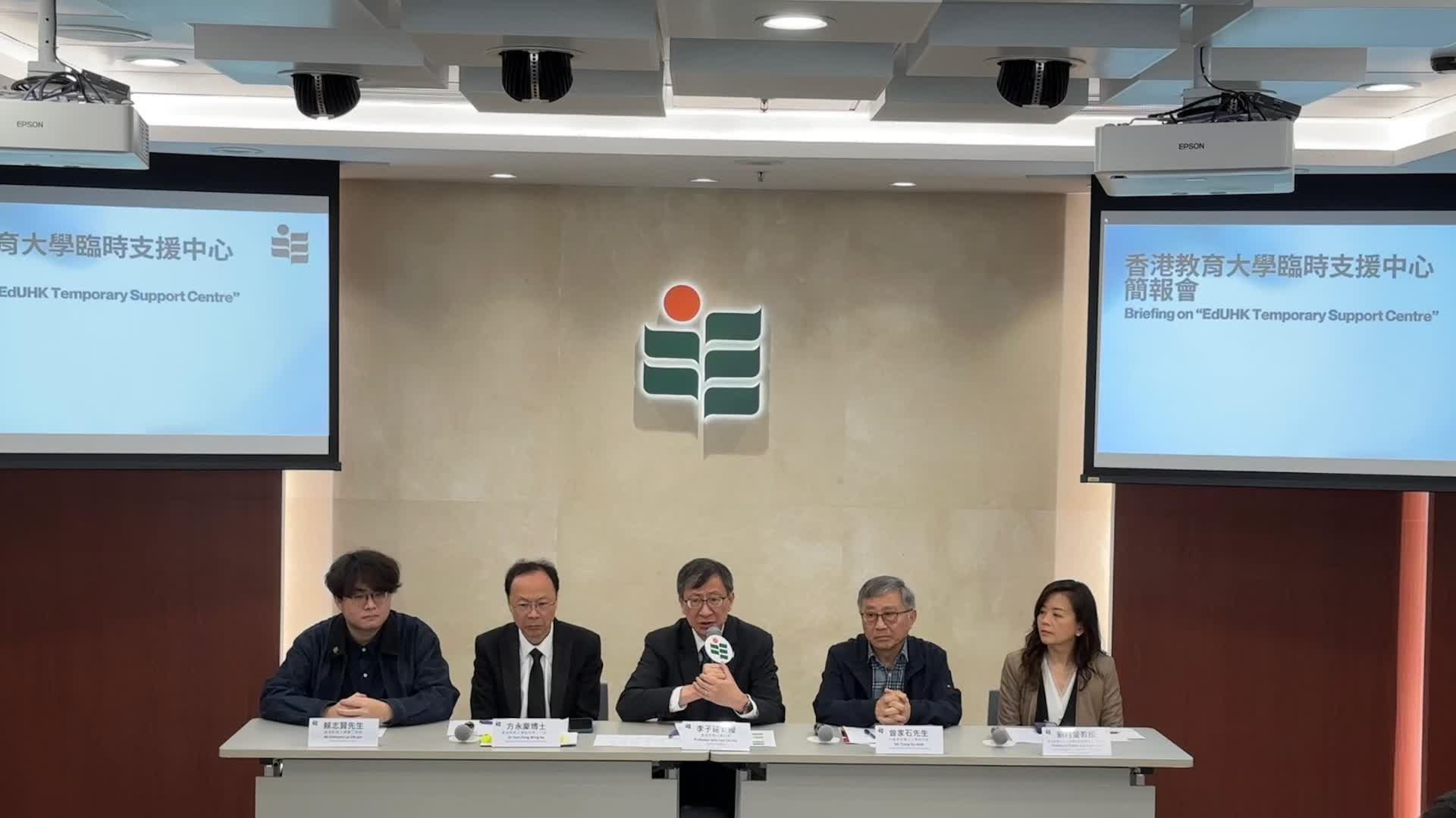今日教大召開媒體簡報會由教大校長李子建教授、大埔浸小校監曾家石先生、教大副校長(行政)方永豪博士、教大心理學系教授兼臨床心理學家劉月瑩教授,以及正就讀教大教育學士課程的義工老師代表賴志賢同學出席,介紹臨時支援中心的運作情況。