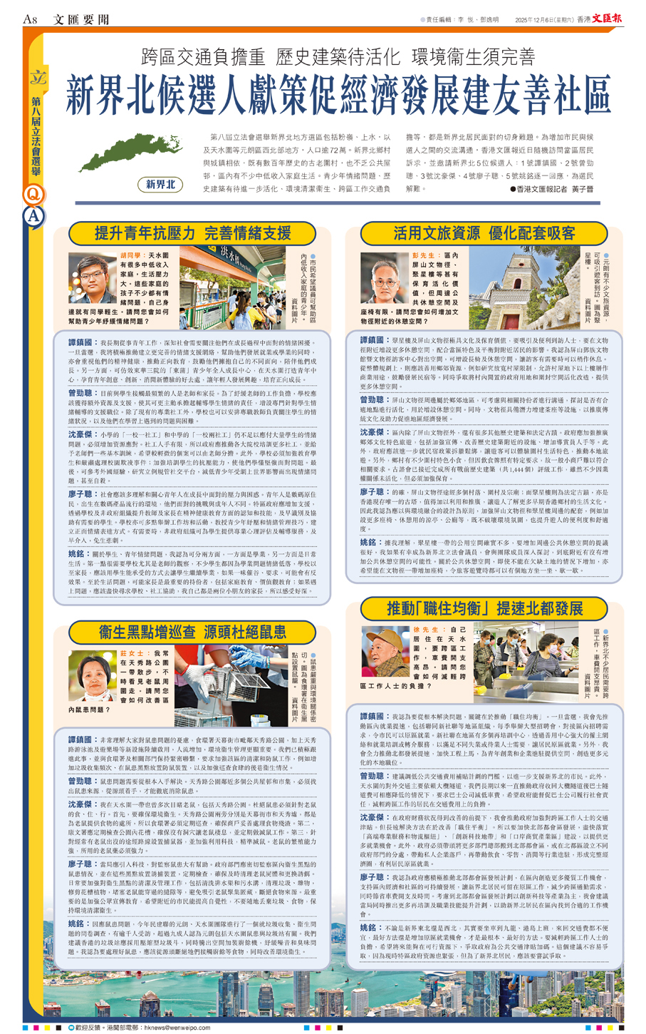 (香港文匯報記者 黃子晉)第八屆立法會選舉新界北地方選區包括粉嶺、上水,以及天水圍等元朗區西北部地方,人口逾72萬。新界北鄉村與城鎮相依,既有數百年歷史的古老圍村,也不乏公共屋邨,區內有不少中低收入家庭生活。青少年情緒問題、歷史建築有待進一步活化、環境清潔衞生、跨區工作交通負擔等,都是新界北居民面對的切身難題。為增加市民與候選人之間的交流溝通,香港文匯報近日隨機訪問當區居民訴求,並邀請新界北5位候選人:1號譚鎮國、2號曾勁聰、3號沈豪傑、4號廖子聰、5號姚銘逐一回應,為選民解難。