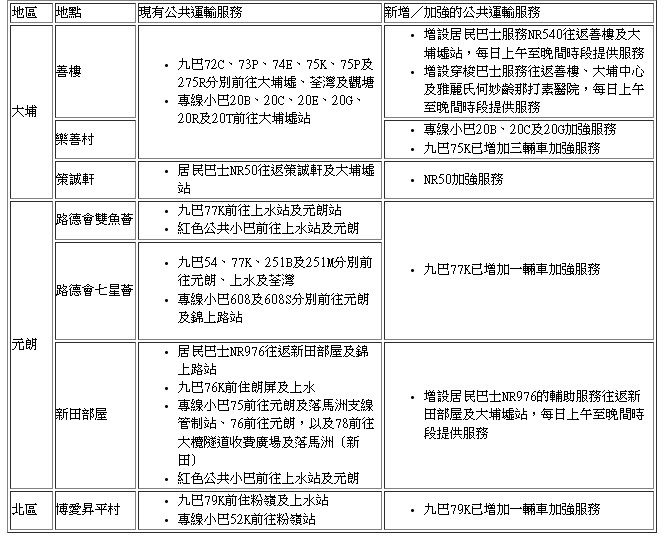 其中,大埔善樓已增設穿梭巴士服務往返大埔中心及雅麗氏何妙齡那打素醫院;元朗新田部屋則已增設居民巴士的輔助服務往返大埔墟站。