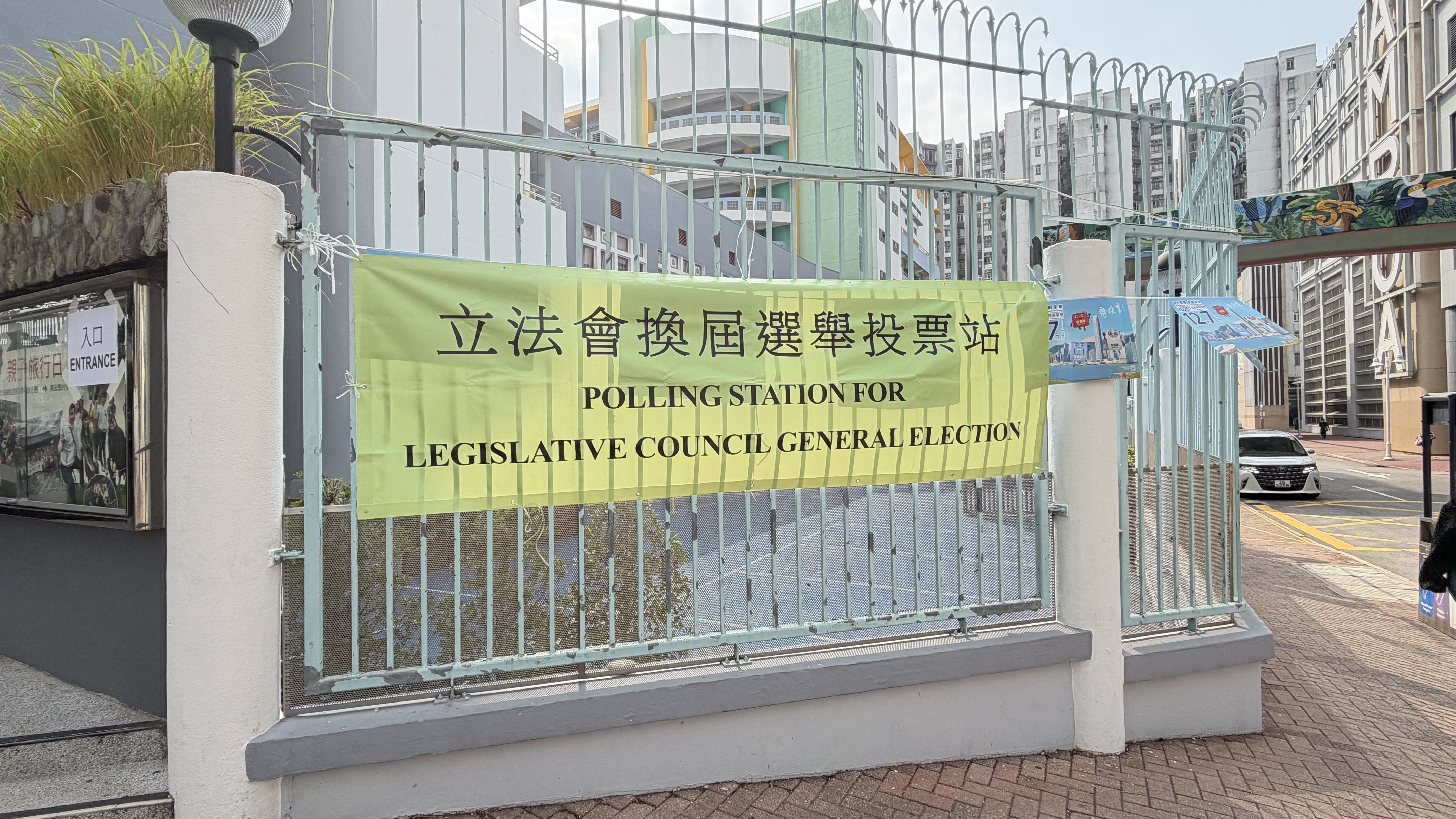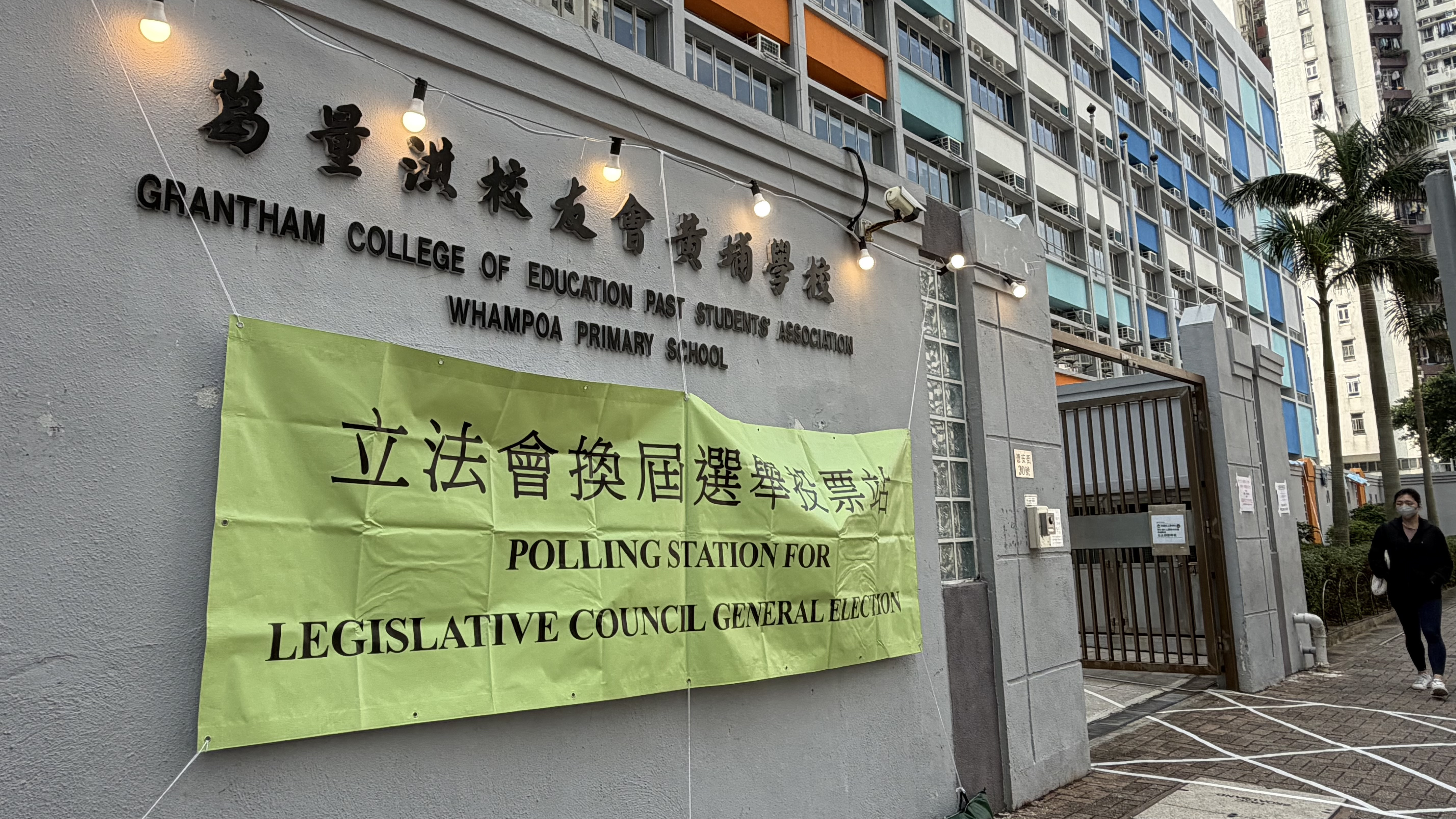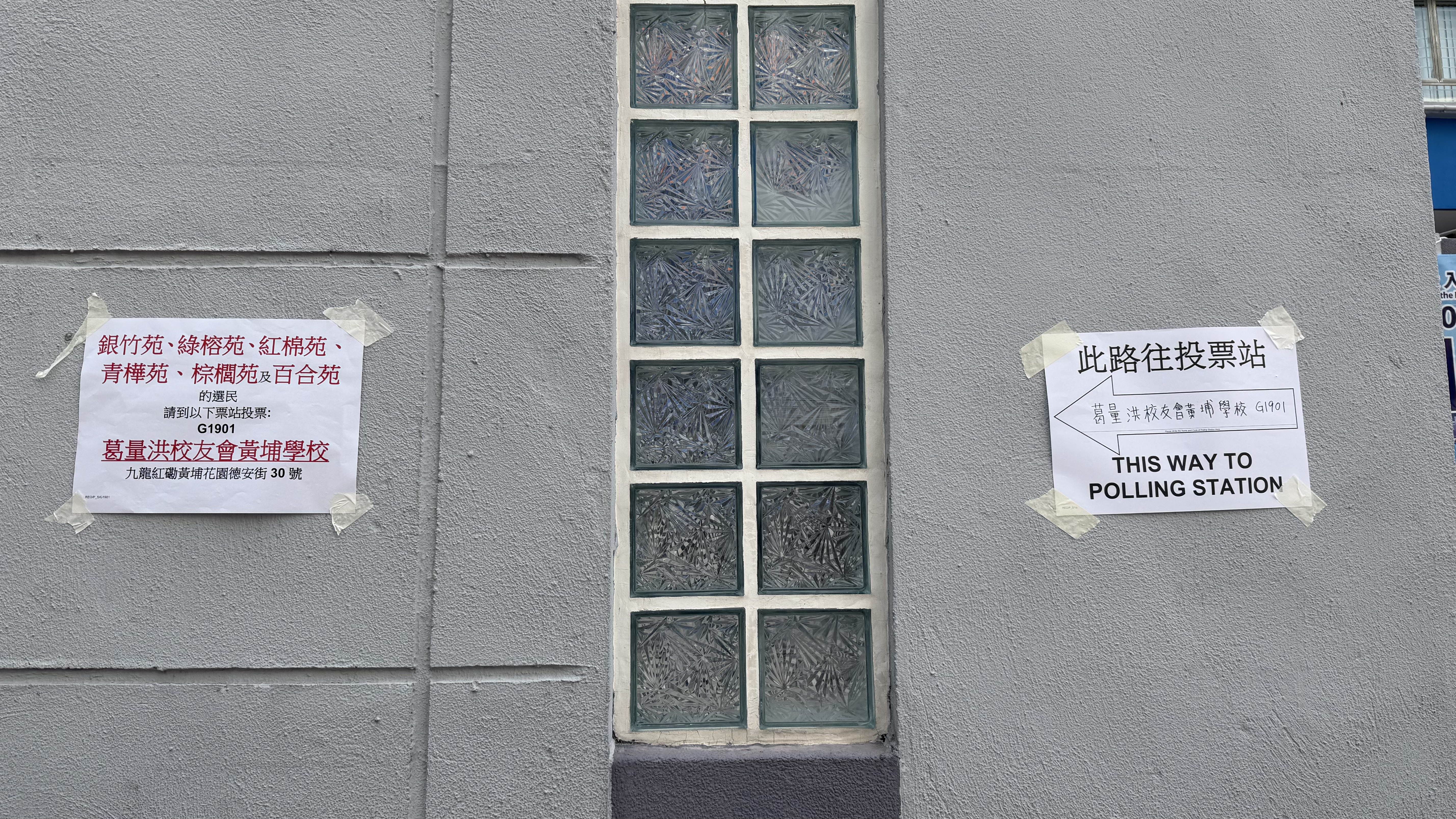 位於九龍城區的幾個票站,包括葛量洪校友會黃埔學校、聖公會奉基小學的門口已經拉好橫幅,橫幅寫有「立法會換屆選舉投票站」字樣,站票附近都有箭頭指示標語,有票站職員在布置現場。