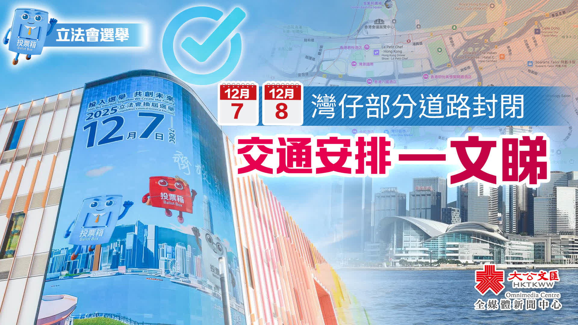 大公文匯全媒體報道,為配合2025年立法會換屆選舉,運輸署發布公告表示,將在灣仔實施特別交通及運輸安排,12月7日(星期日)至12月8日(星期一)灣仔部分道路將臨時封閉,公共運輸亦有特別安排。