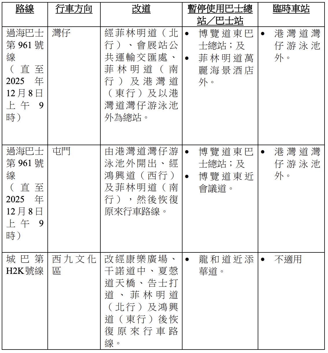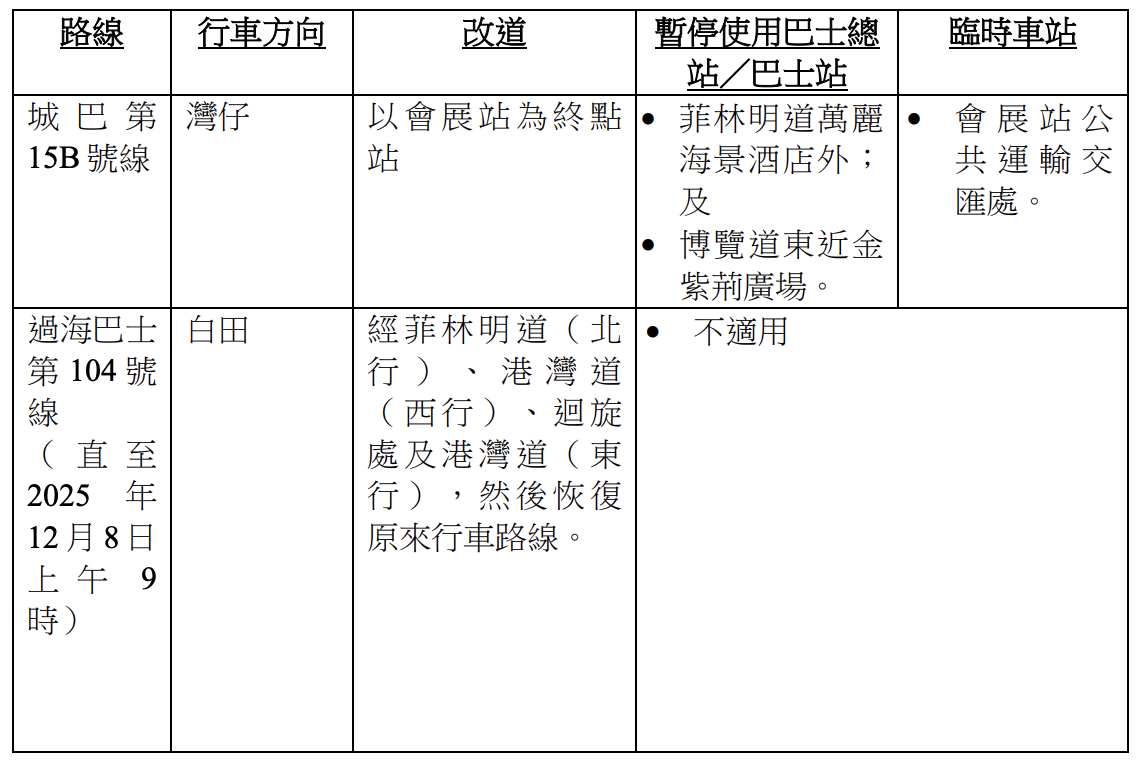 此外,由12月8日上午7時至上午9時博覽道以北金紫荊廣場外的一段博覽道東(包括上落客區)將臨時封閉。