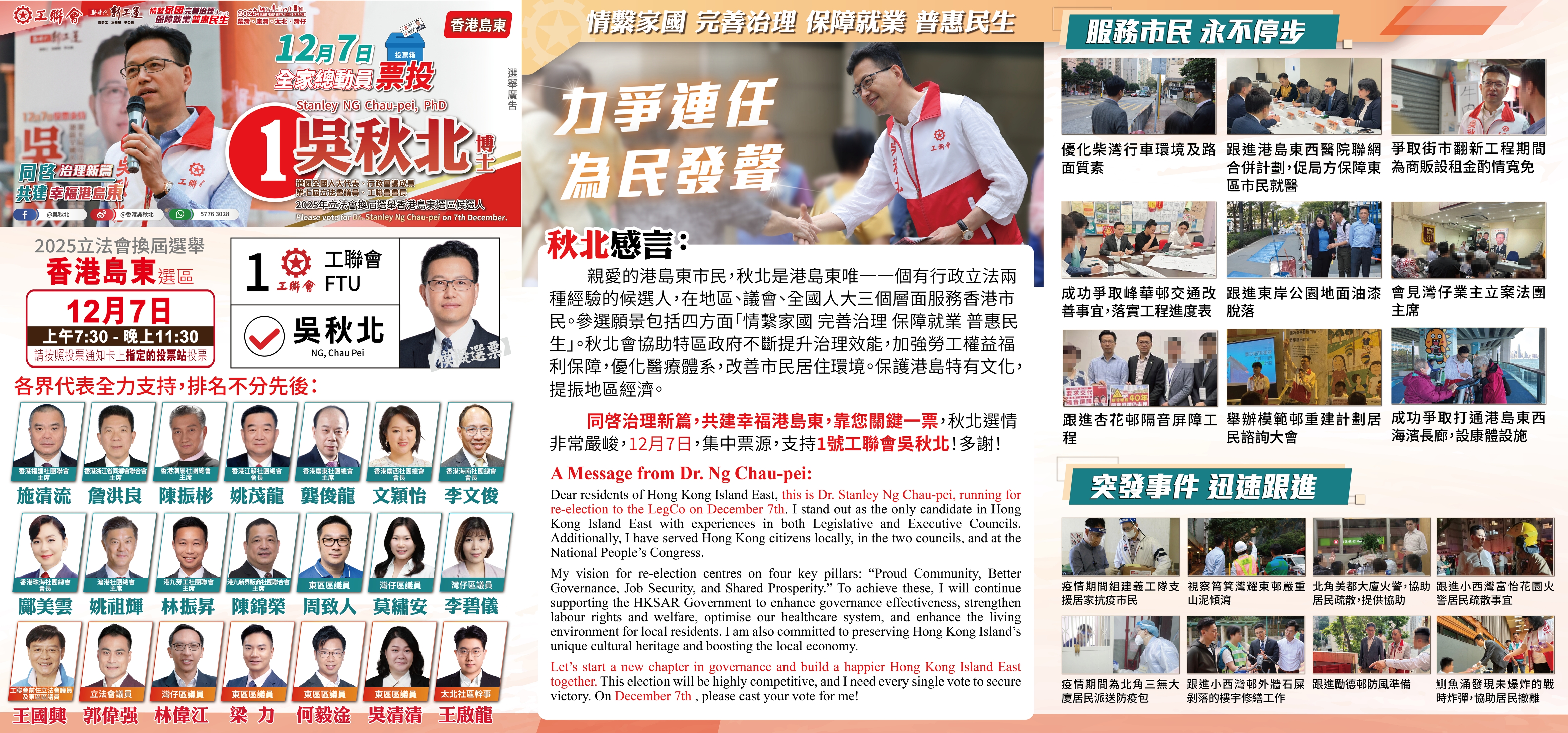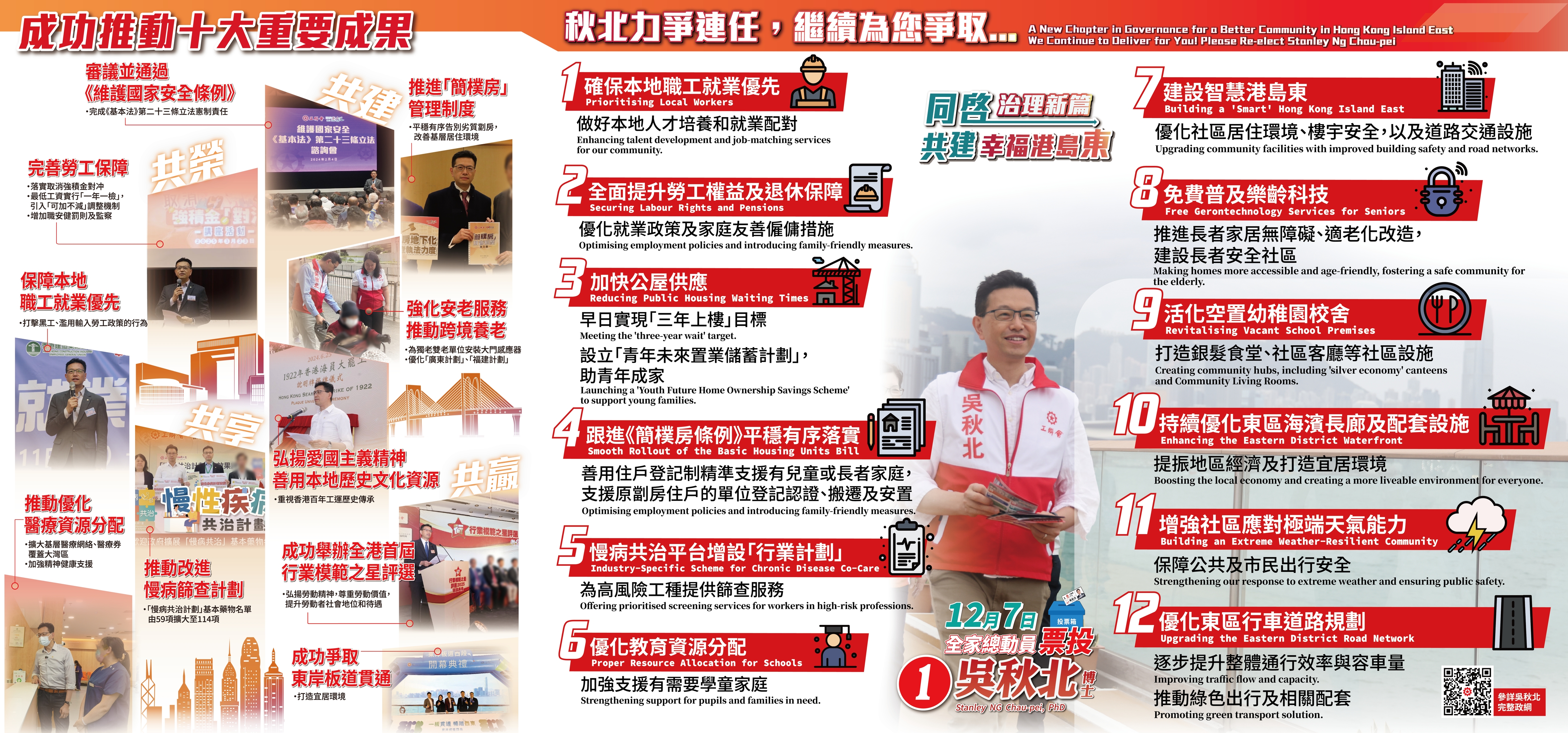 1號候選人吳秋北為工聯會會長,今次競逐連任。他表示,工聯會爭取18年的東岸板道貫通,由自己接棒推進,在沿岸興建休憩、康體措施,為當區市民打造宜居環境,豐富當區旅遊資源。交通方面,他倡議優化東區行車道路規劃,逐步提升整體通行效率與容車量;推動綠色出行及相關配套等。經濟發展方面,他提倡打好「旅遊+」系列組合拳,以創新思維促成「+體育」「+演唱會」「+盛事」結合發展;放寬小販牌照申請及經營限制等。至於支援青年方面,吳秋北建議推動「職學雙軌」,加強職業配對服務;建議設立「青年未來置業儲蓄計劃」,助青年在香港成家。