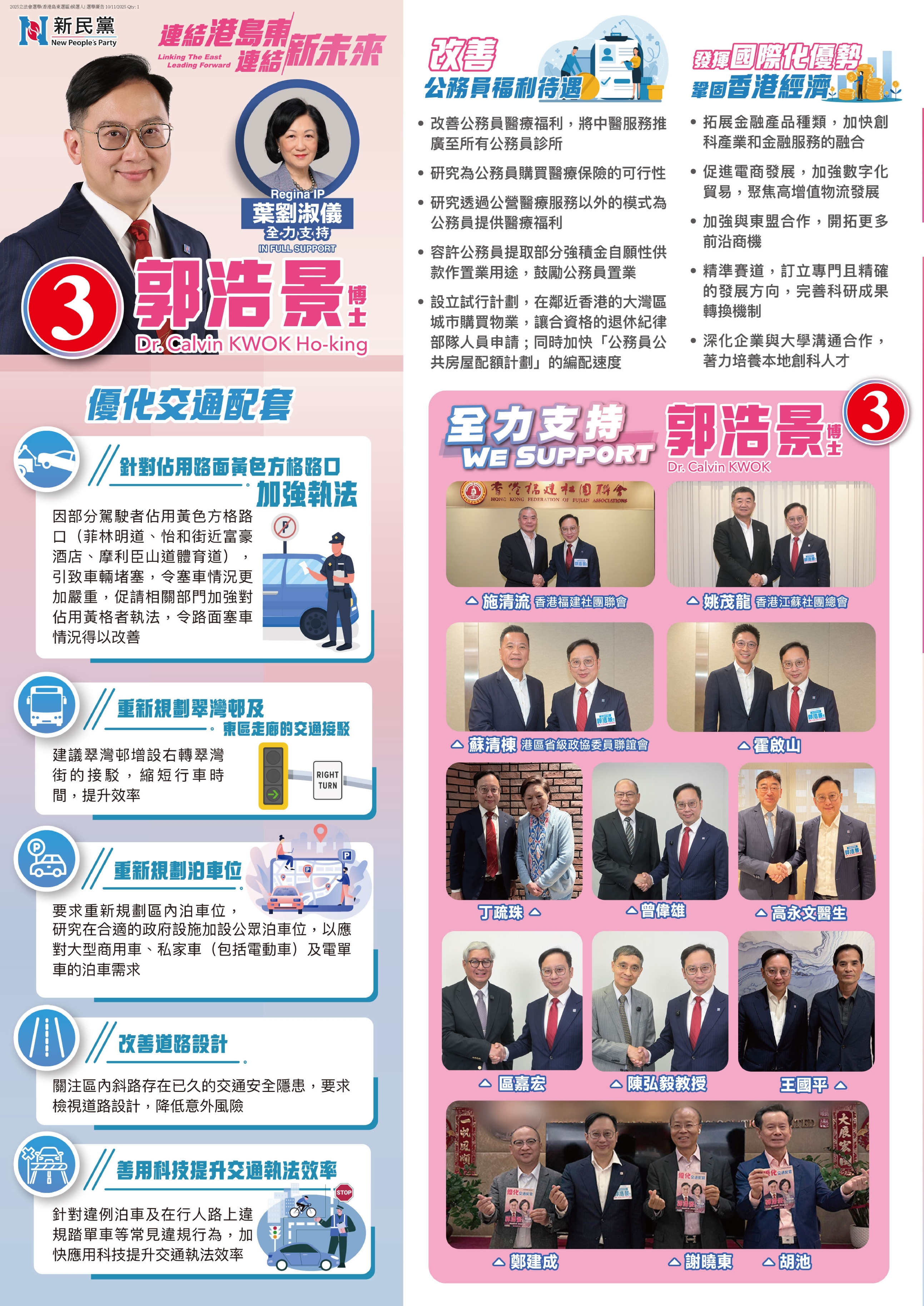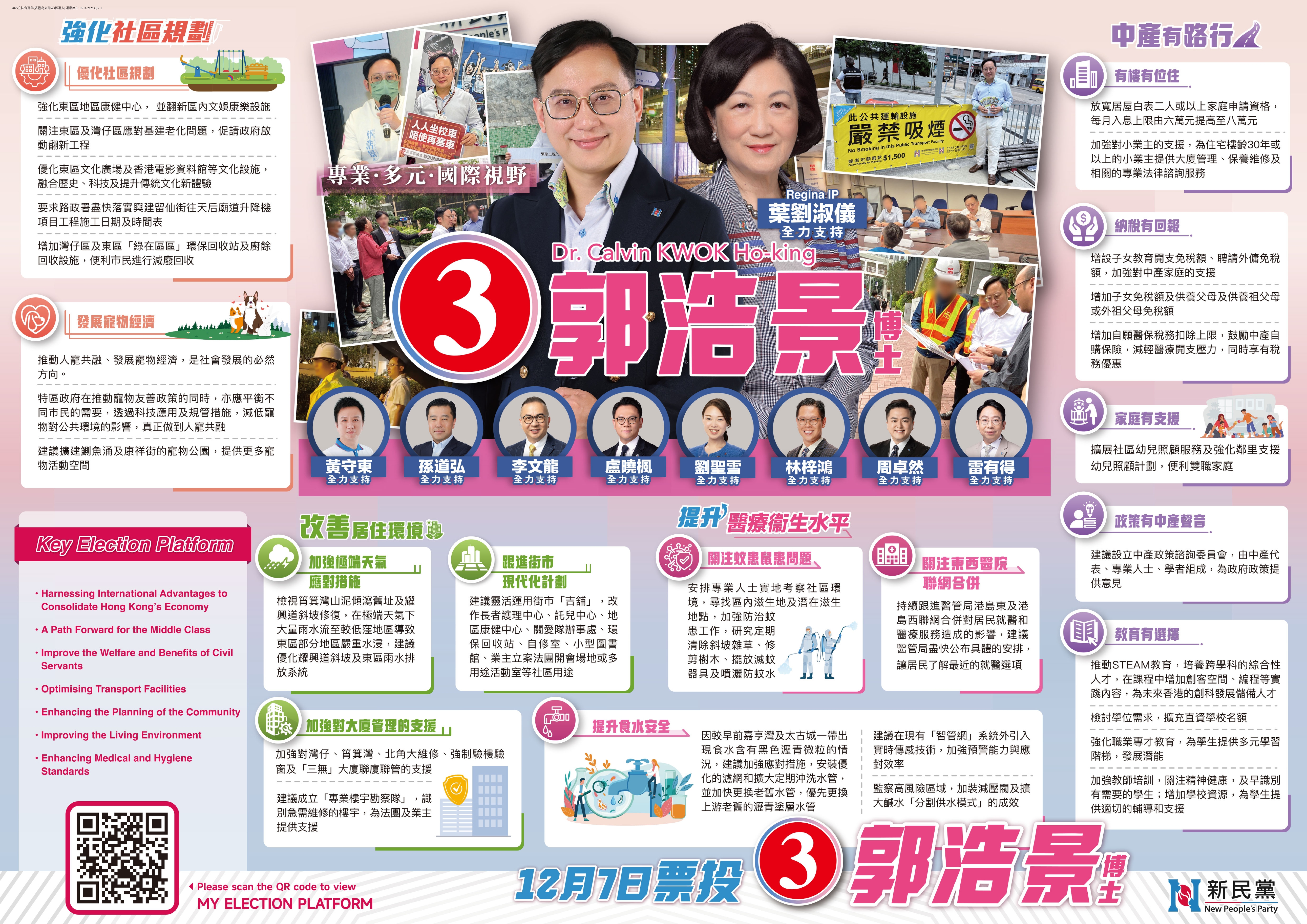今次代表新民黨出戰港島東選區的3號候選人郭浩景認為,應優化交通配套,針對佔用路面黃色方格路口加強執法,重新規劃柴灣翠灣邨及東區走廊的交通接駁,善用科技提升交通執法效率等。經濟方面,他提倡發展寵物經濟,擴建鰂魚涌及康祥街的寵物公園,提供更多寵物活動空間;同時促進電商發展,加強數字化貿易,及加強與東盟合作。青年發展方面,他建議推動STEAM教育,培養跨學科人才;深化企業與大學溝通合作,培養本地創科人才;同時支持中產家庭在住屋、教育、子女等方面支援,如放寬居屋白表二人或以上家庭申請資格,每月入息提高至8萬元;增設子女教育開支免稅額等。