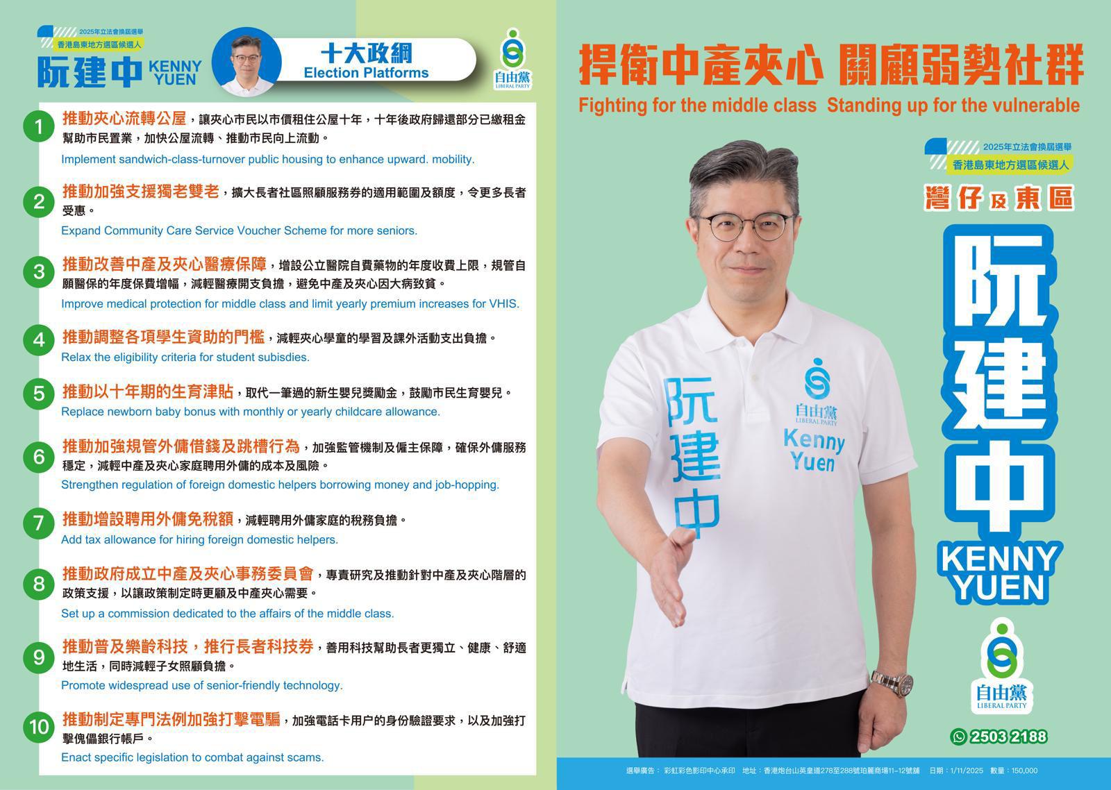 4號候選人阮建中,來自自由黨,同樣是東區區議員。他表示,將捍衛中產夾心階層權益、關顧弱勢。他形容自己是唯一代表中產與夾心階層的聲音。阮建中的十大政綱包括:推動夾心流轉公屋,推動加強支援獨老雙老,推動改善中產及夾心醫療保障,推動調整各項學生資助的門檻,推動以十年期的生育津貼,推動加強規管外傭借錢及跳槽行為,推動增設聘用外傭免稅額,推動政府成立中產及夾心事務委員會,推動普及樂齡科技,推行長者科技券以及推動制定專門法例加強打擊電騙。另外,他建議增設公立醫院自費藥物的年度收費上限,規管自願醫保的年度保費增幅等。