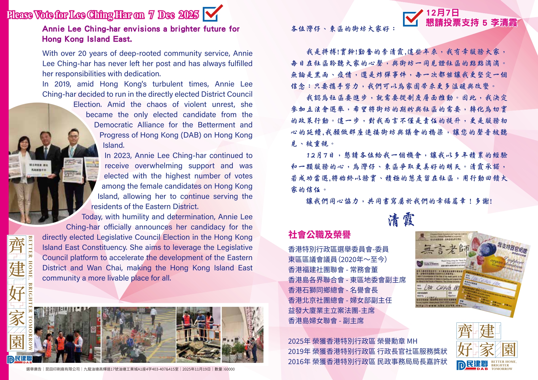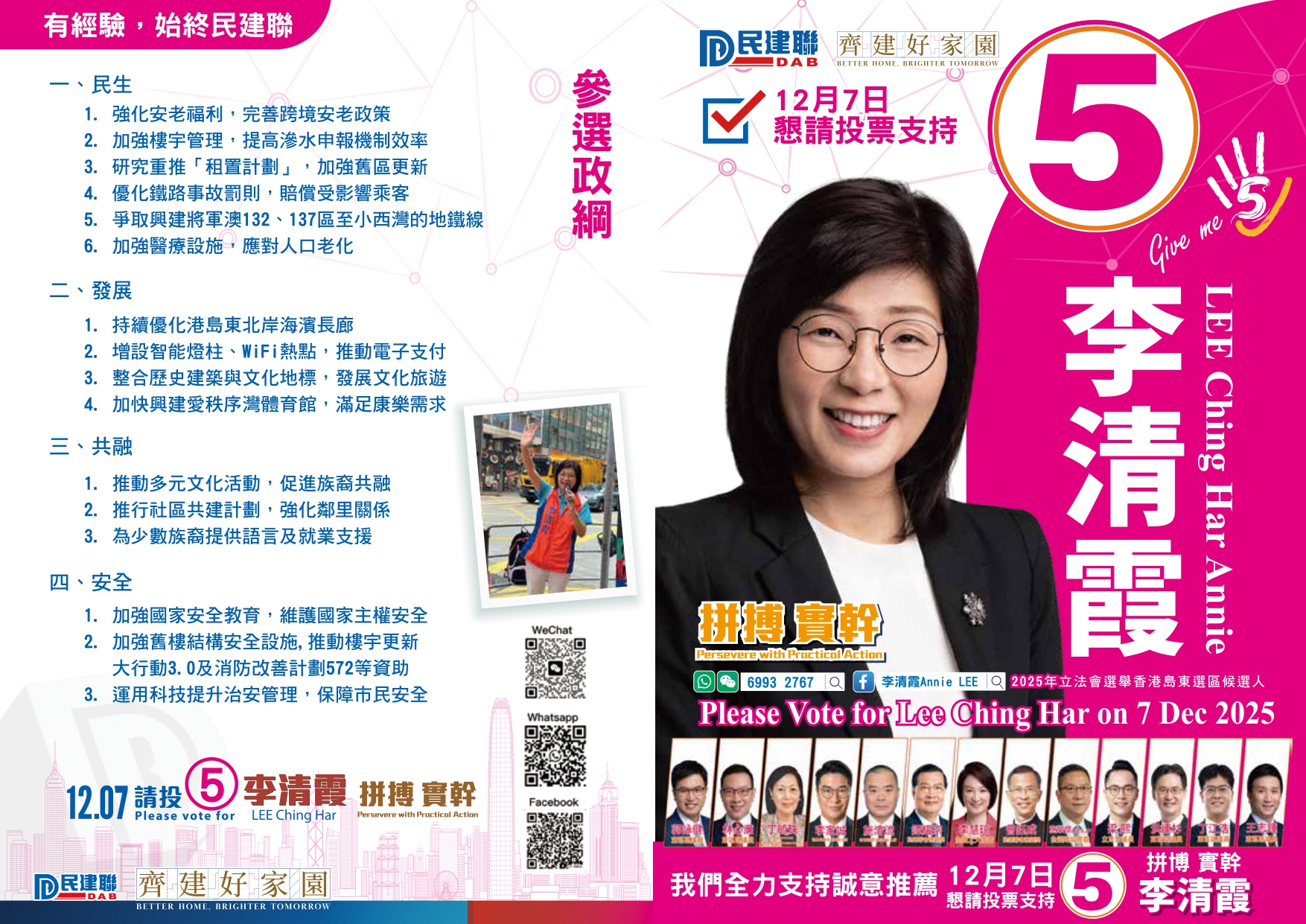 當區5號候選人,為民建聯派出的另一位女將、東區區議員李清霞。交通方面,她爭取優化鐵路事故罰則,賠償受影響乘客;爭取興建將軍澳132、137區至小西灣的地鐵線。經濟方面,她主張持續優化港島東北岸海濱長廊;增設智能燈柱、Wi-Fi熱點,推動電子支付;整合歷史建築與文化地標,發展文化旅遊;加快興建愛秩序灣體育館,滿足康樂需求;推動多元文化活動,促進族裔共融。此外,李清霞建議推行社區共建計劃,強化鄰里關係;研究重推「租置計劃」,加強舊區更新;運用科技提升治安管理,保障市民安全;加強國家安全教育,維護國家主權安全等。