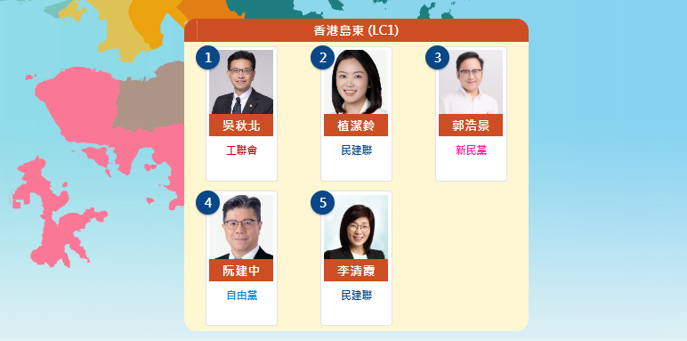 香港島東涵蓋東區和灣仔區,包括北角、太古、筲箕灣、灣仔、銅鑼灣、跑馬地等區域,該區約38萬選民。5位候選人包括爭取連任的現任立法會議員吳秋北,以及4名當區區議員,分別是自由黨阮建中、新民黨郭浩景、民建聯李清霞、民建聯植潔鈴,形成「5爭2」局面。