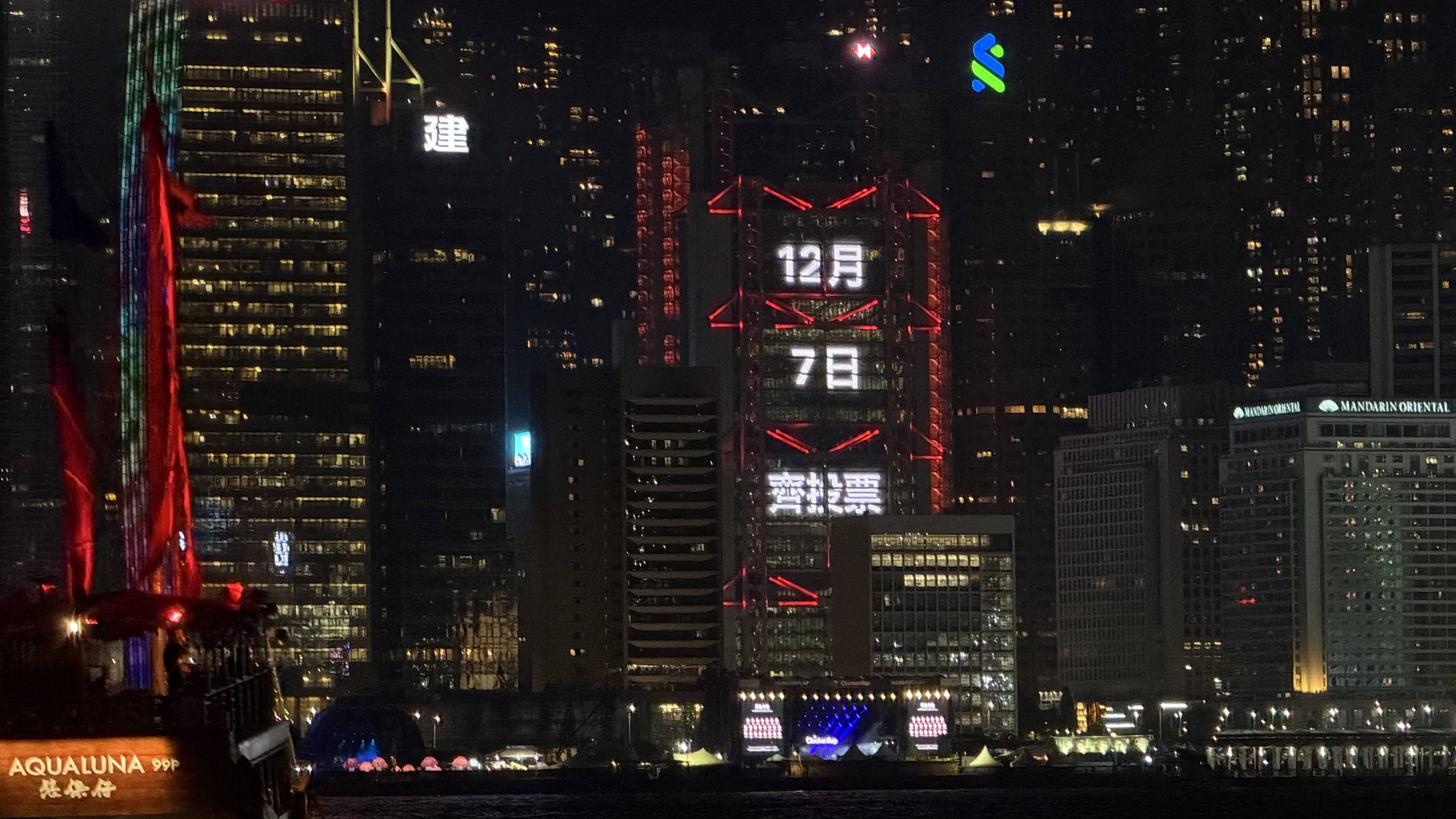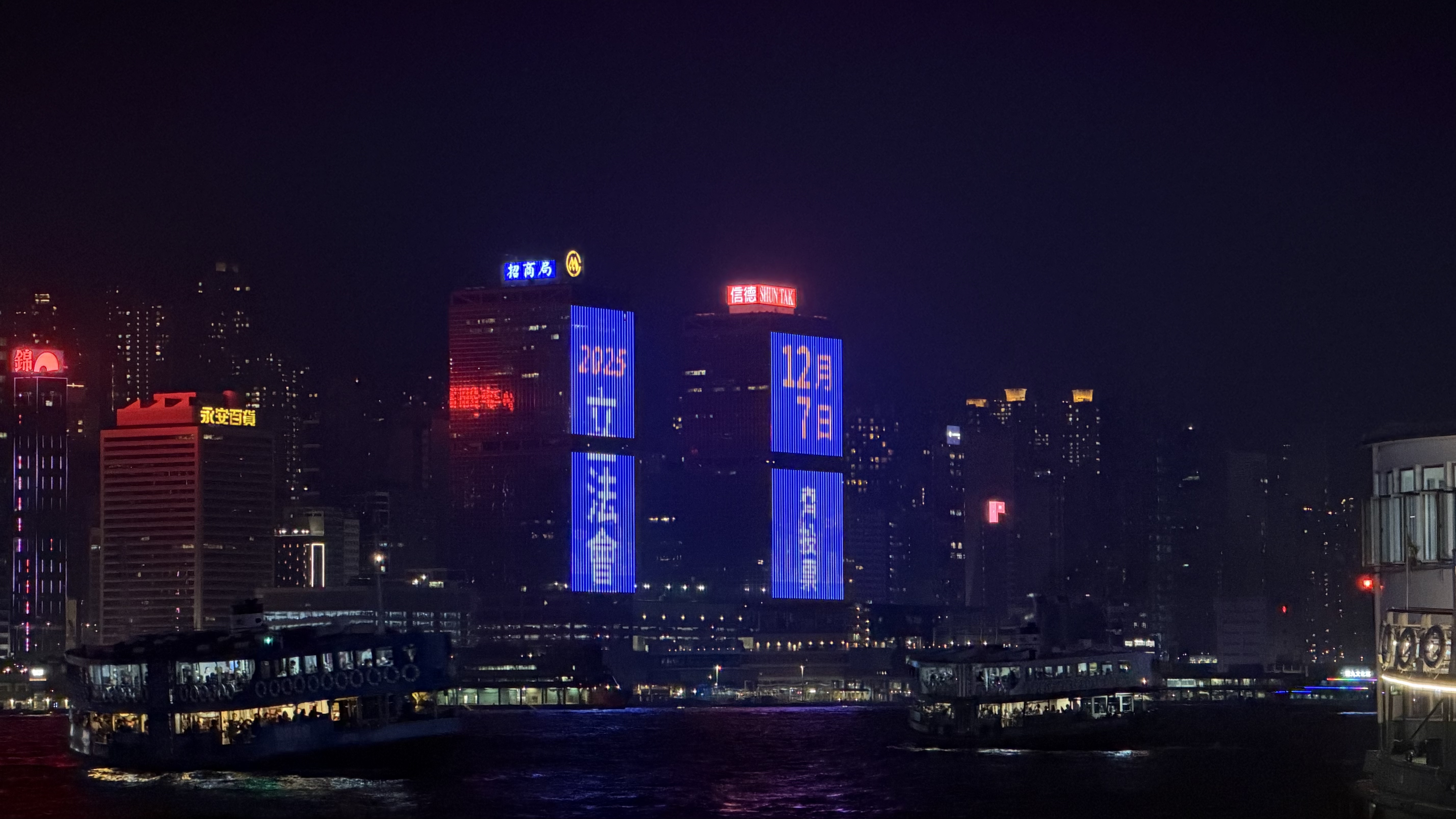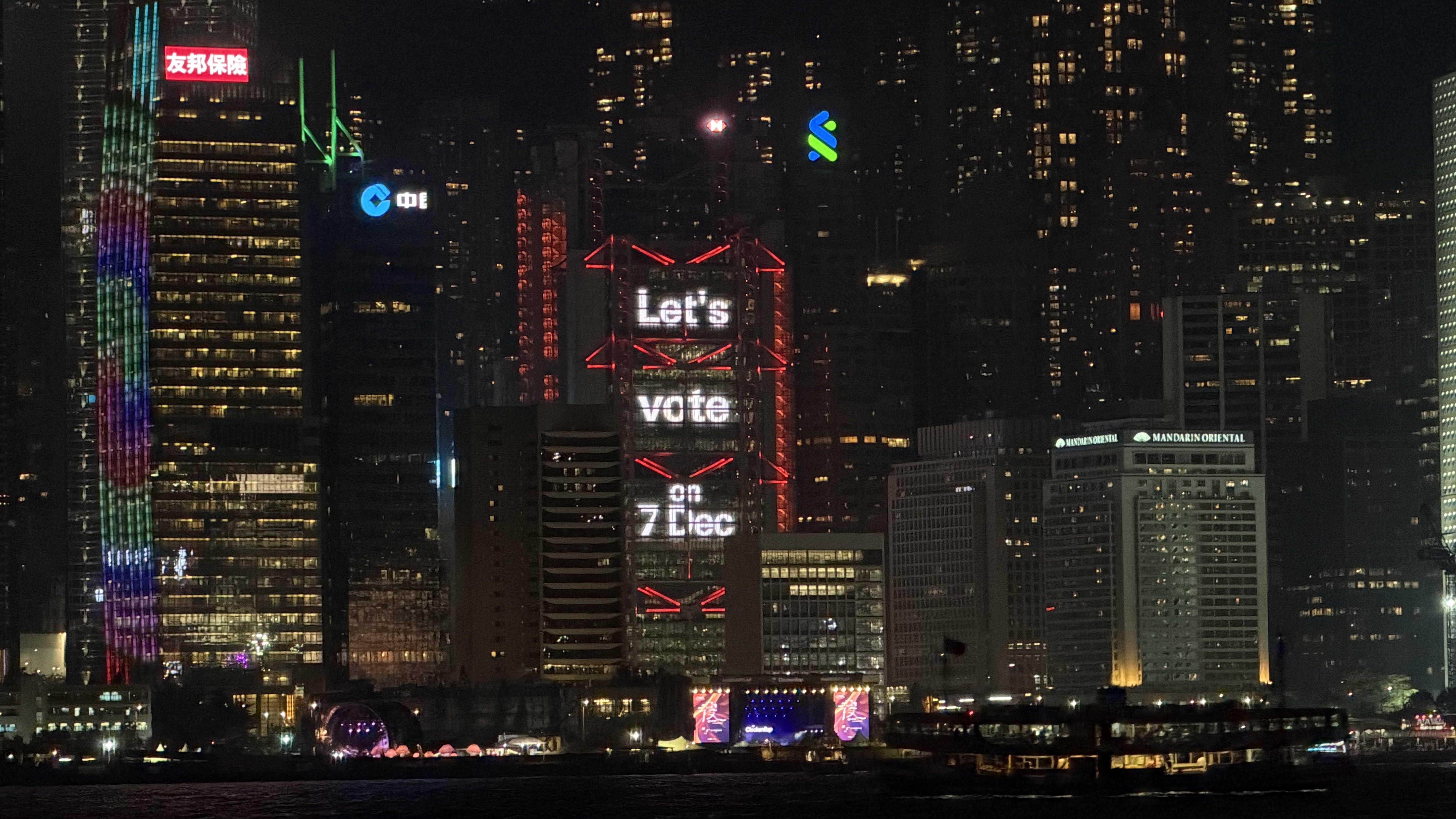 滙豐總行大廈顯示「12月7日齊投票」、「Let's vote on 7 Dec」字樣。與此同時,招商局大廈外墻亦滾動顯示「2025立法會選舉」字樣,而旁邊的信德中心則循環顯示「12月7日齊投票」字樣。
