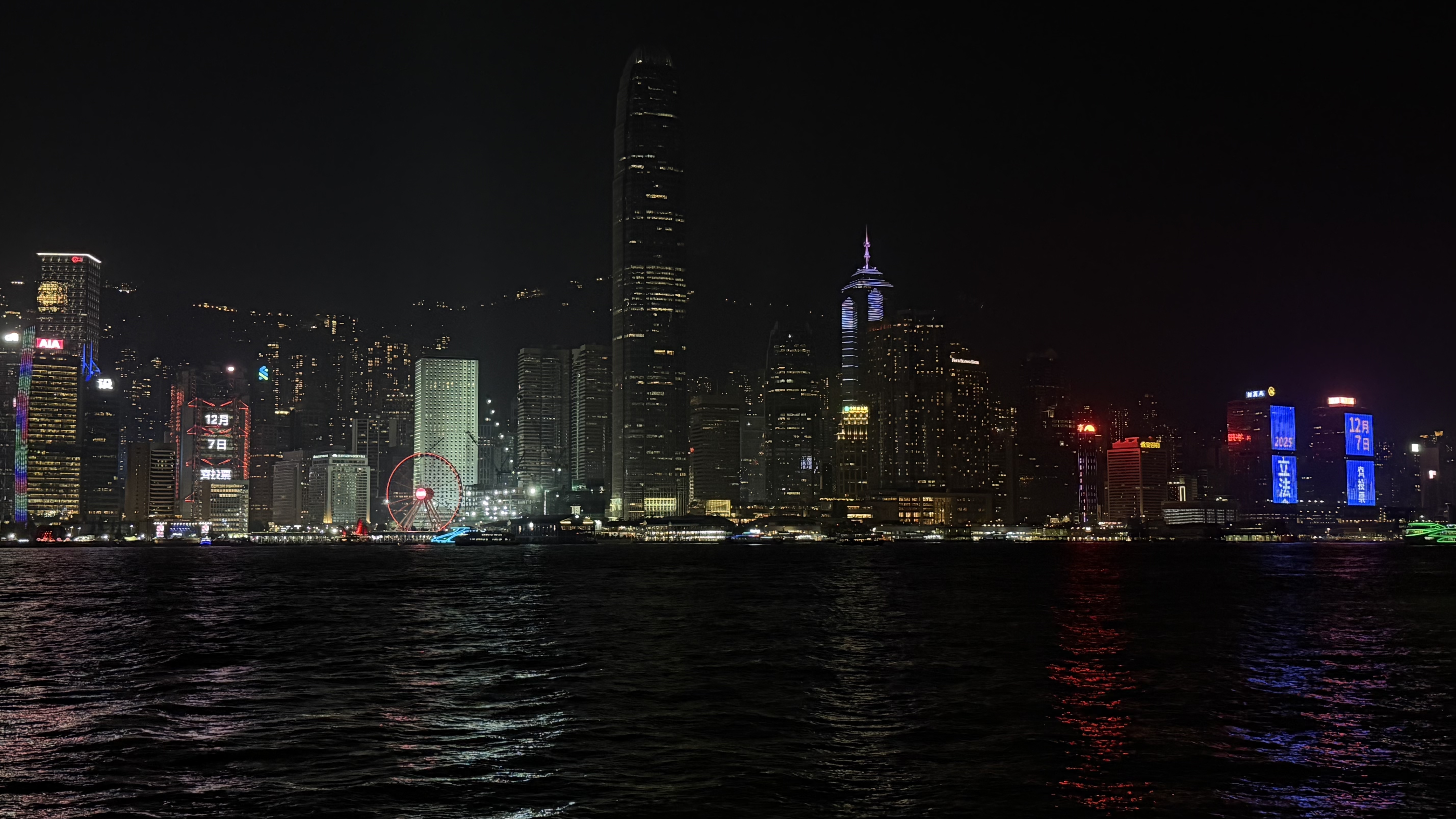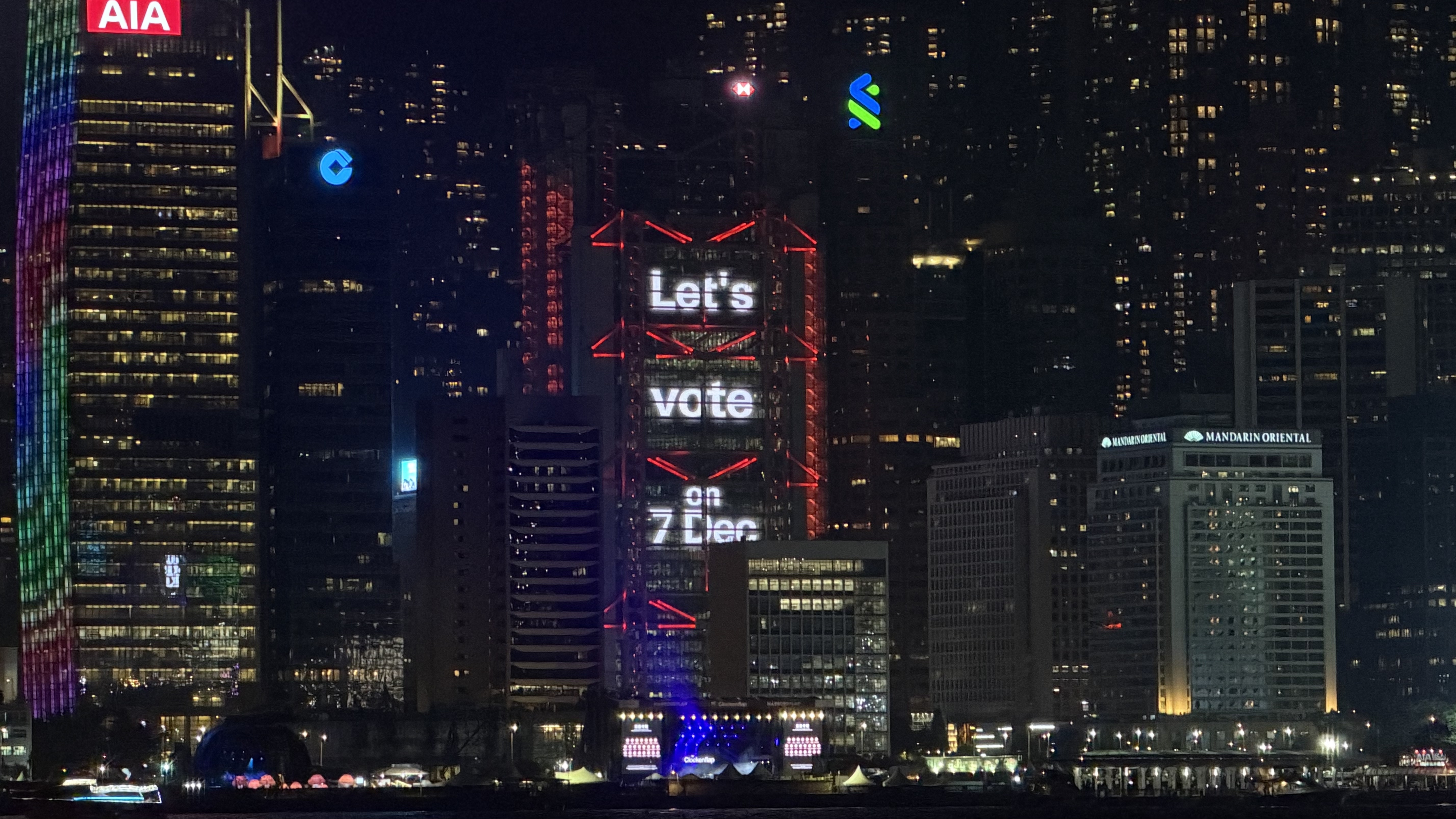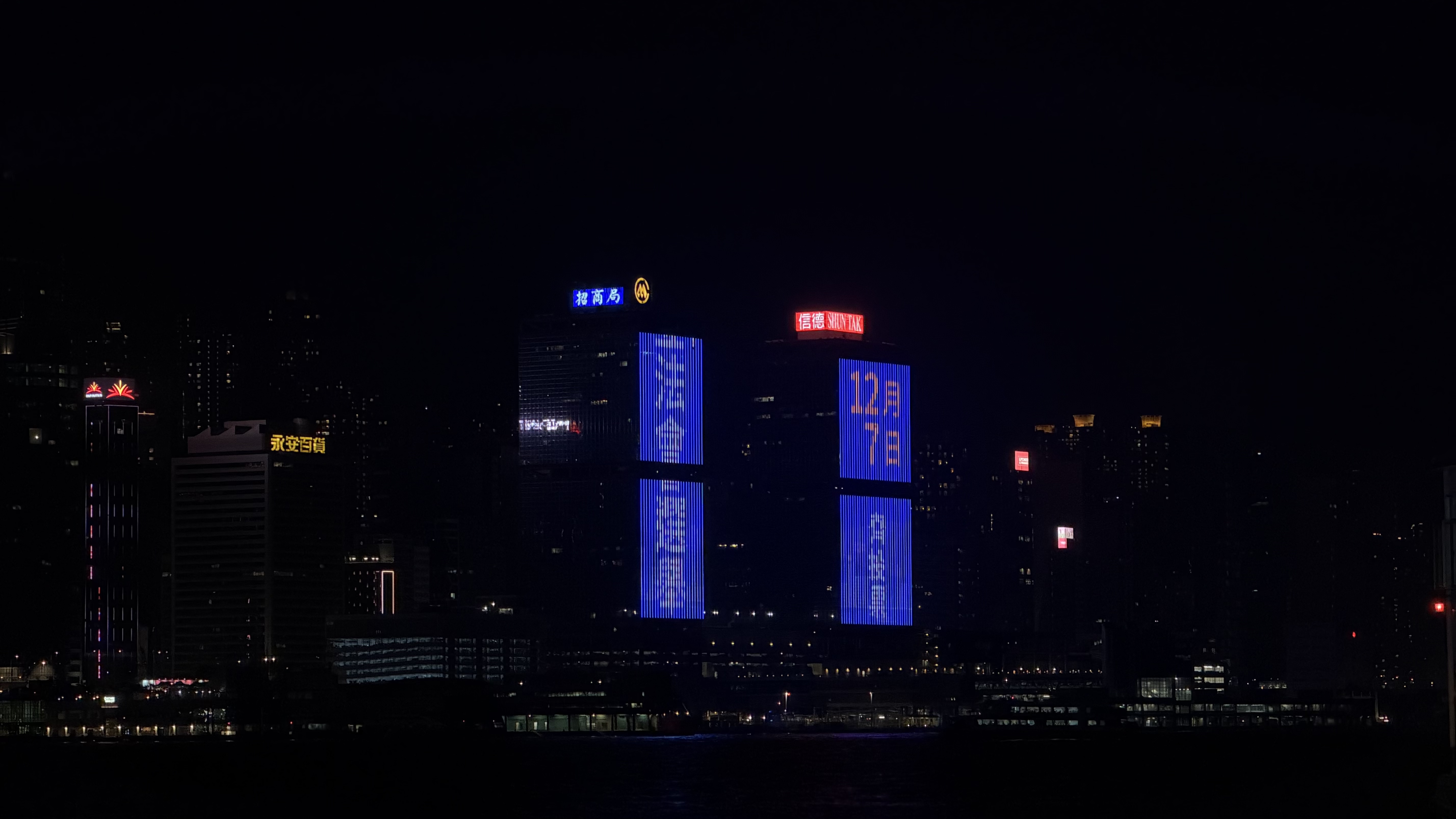 滙豐總行大廈顯示「12月7日齊投票」、「Let's vote on 7 Dec」字樣。與此同時,招商局大廈外墻亦滾動顯示「2025立法會選舉」字樣,而旁邊的信德中心則循環顯示「12月7日齊投票」字樣。