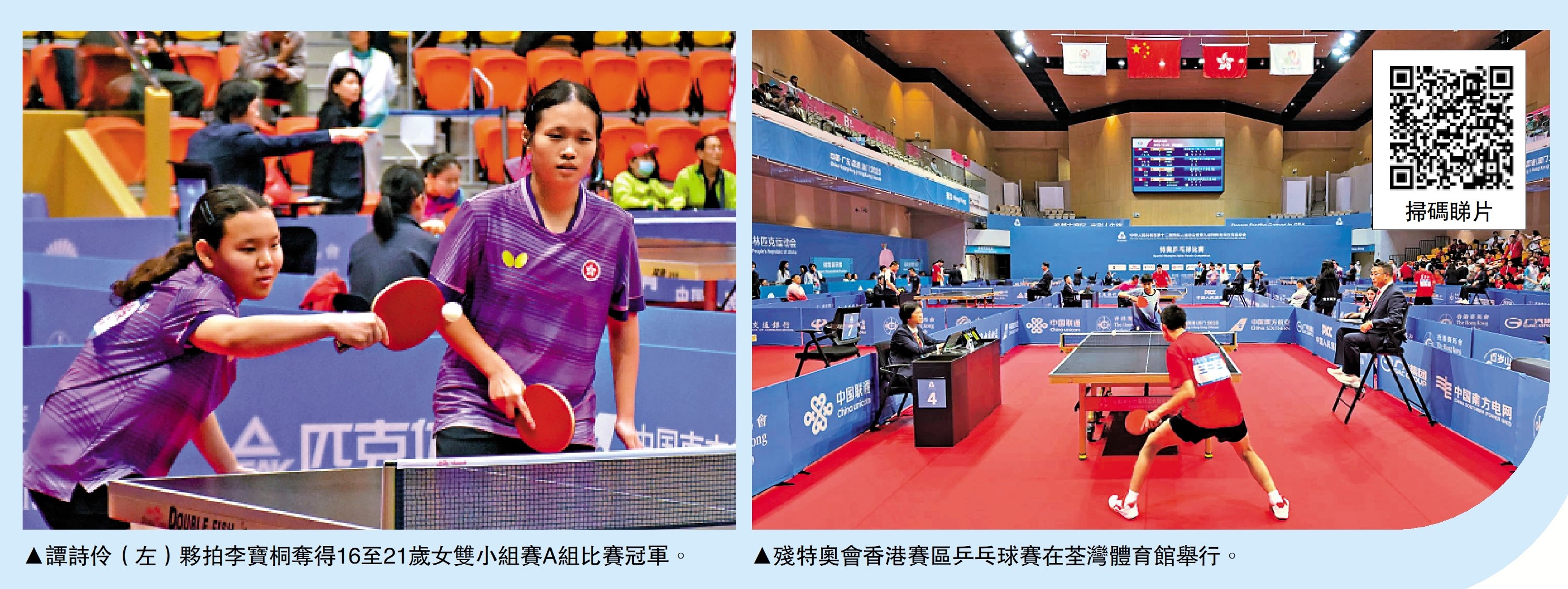 (大公報 記者 張銳)全國第12屆殘疾人運動會暨第9屆特殊奧林匹克運動會的香港賽區特奧乒乓球項目,6日在荃灣體育館正式展開。香港特奧乒乓球隊共派出11名運動員參賽,首日有10人於男子單打及女子雙打項目中亮相。港隊隊員發揮出色,在昨日賽事中共收穫3金3銀2銅,取得亮麗開局。港隊教練葉定璋對首日成績表示滿意,並期望運動員能借此增強信心,迎接隨後8日及9日其餘項目賽事。