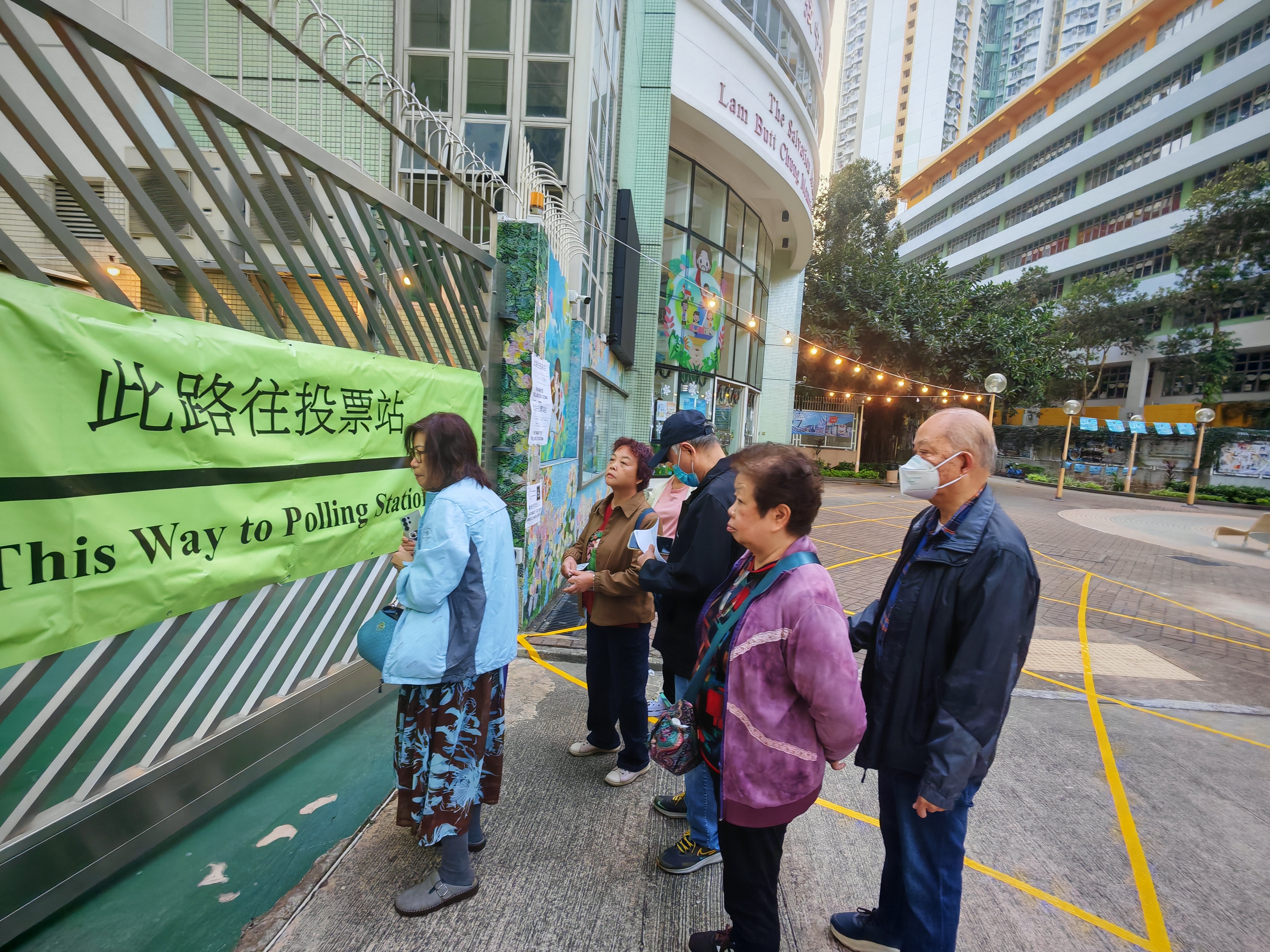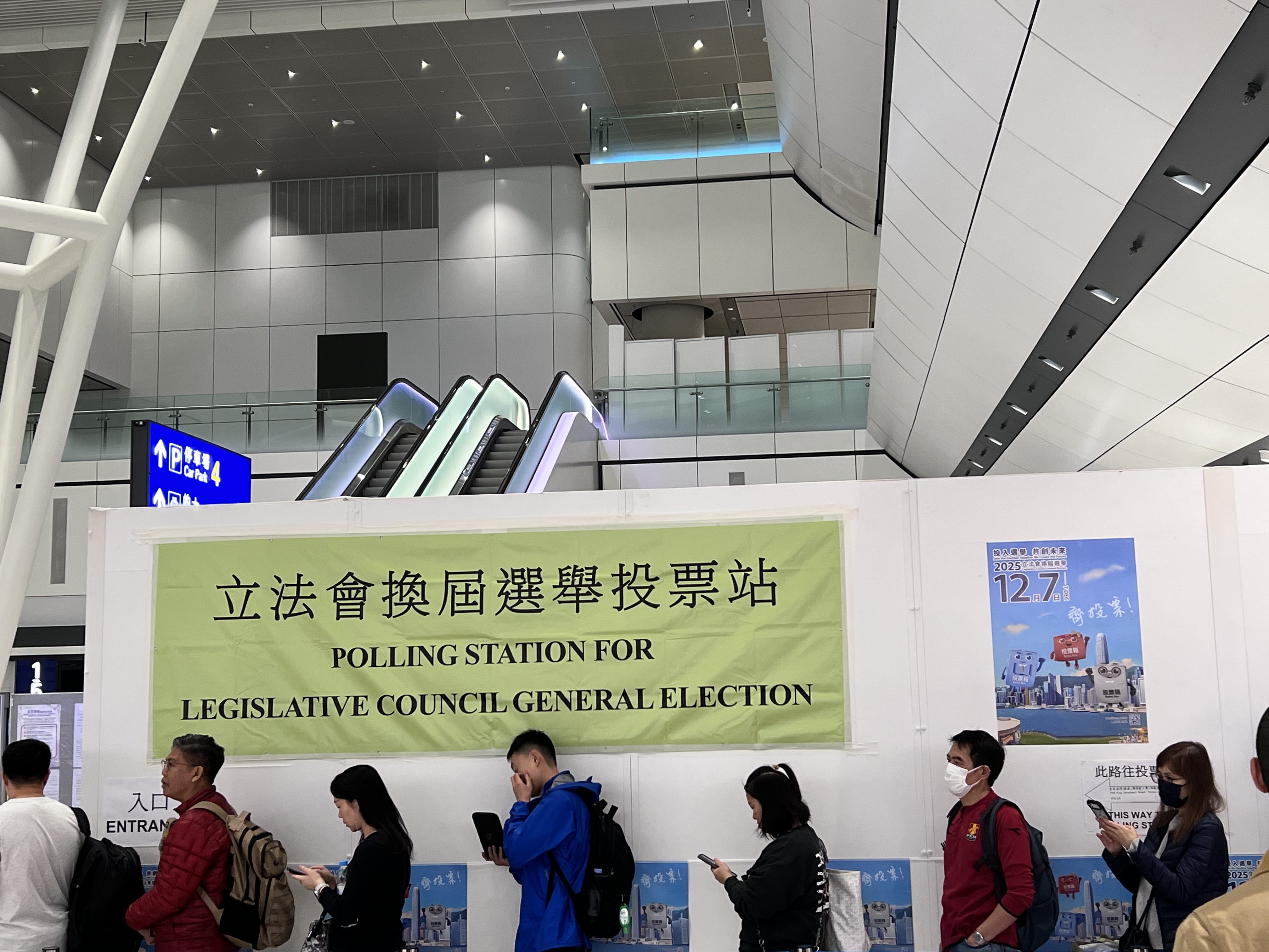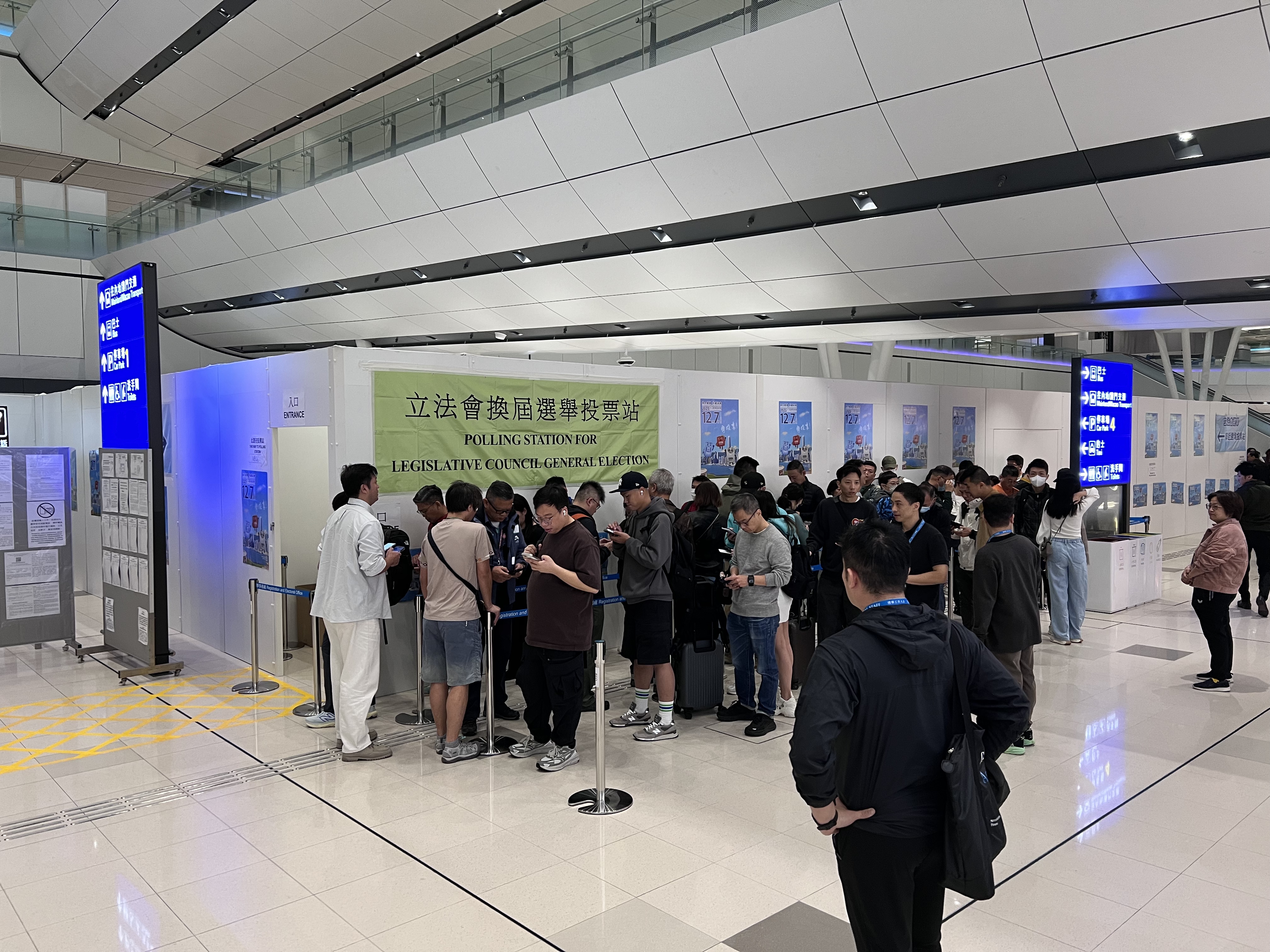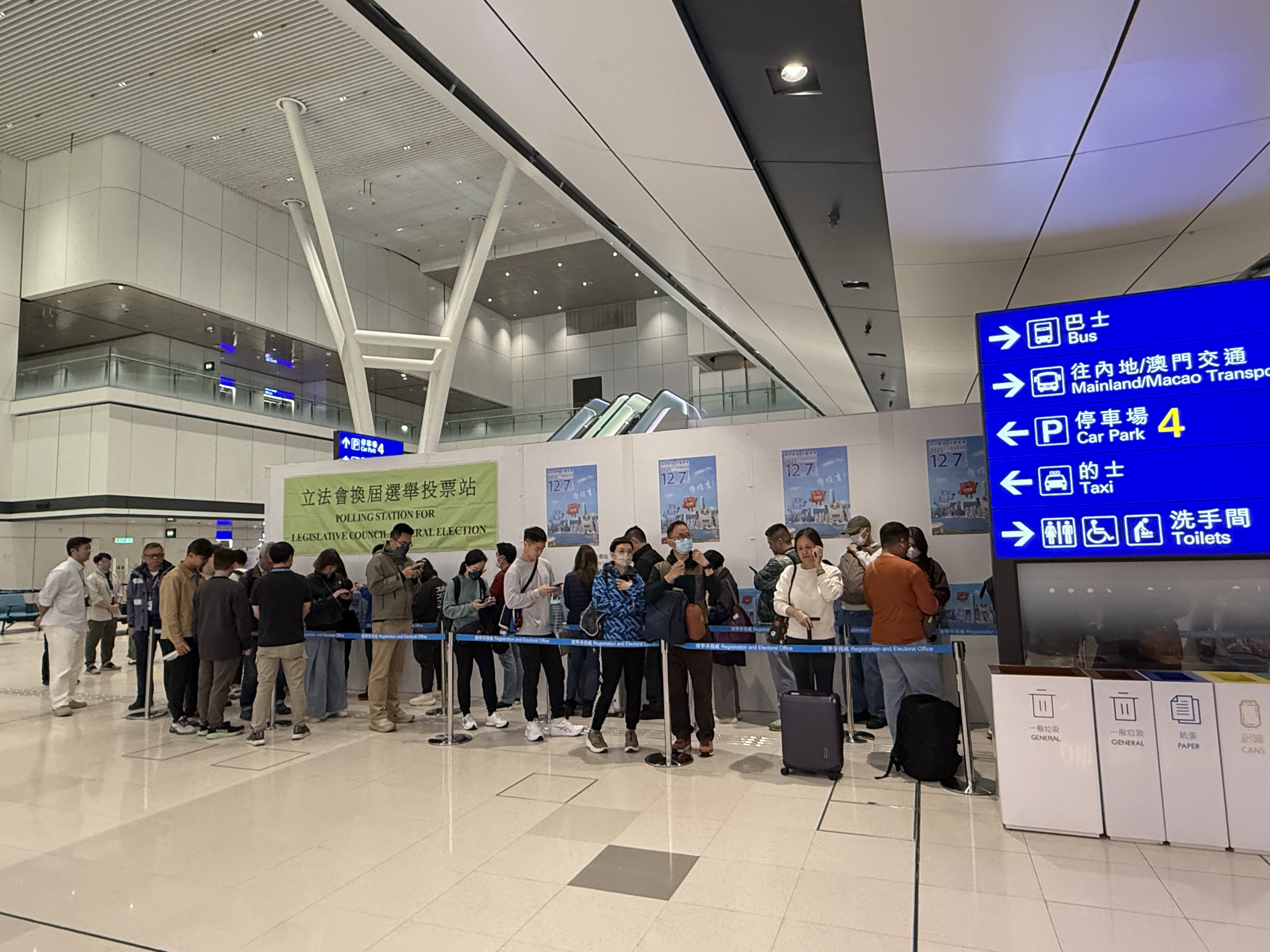 記者在香港國際機場二號客運大樓的鄰近邊境投票站,看到已有逾60位選民在現場排隊準備投票,現場排起長隊。7點30分,選民準時入投票區,工作人員提醒大家拿出身份證。