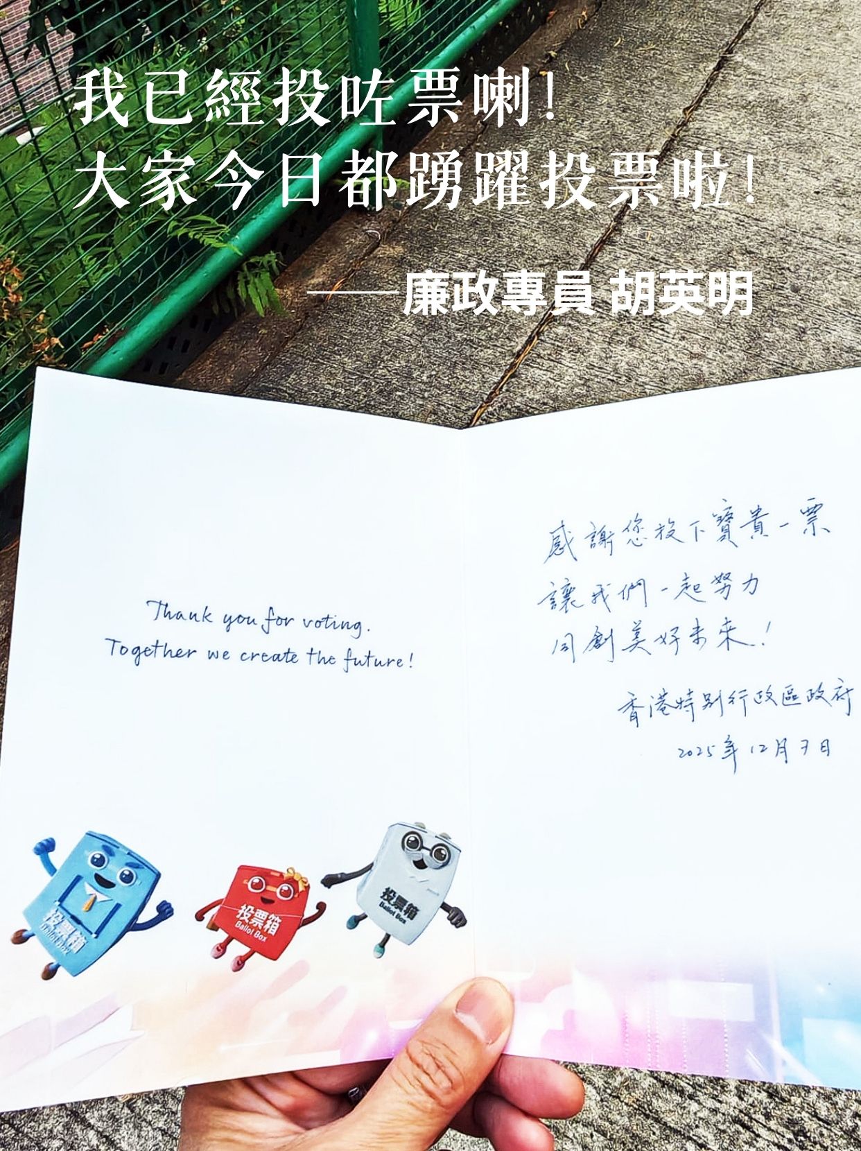 大家都要踴躍投票,一起選出有抱負、有能力、有擔當的立法會議員,同創美好的未來!