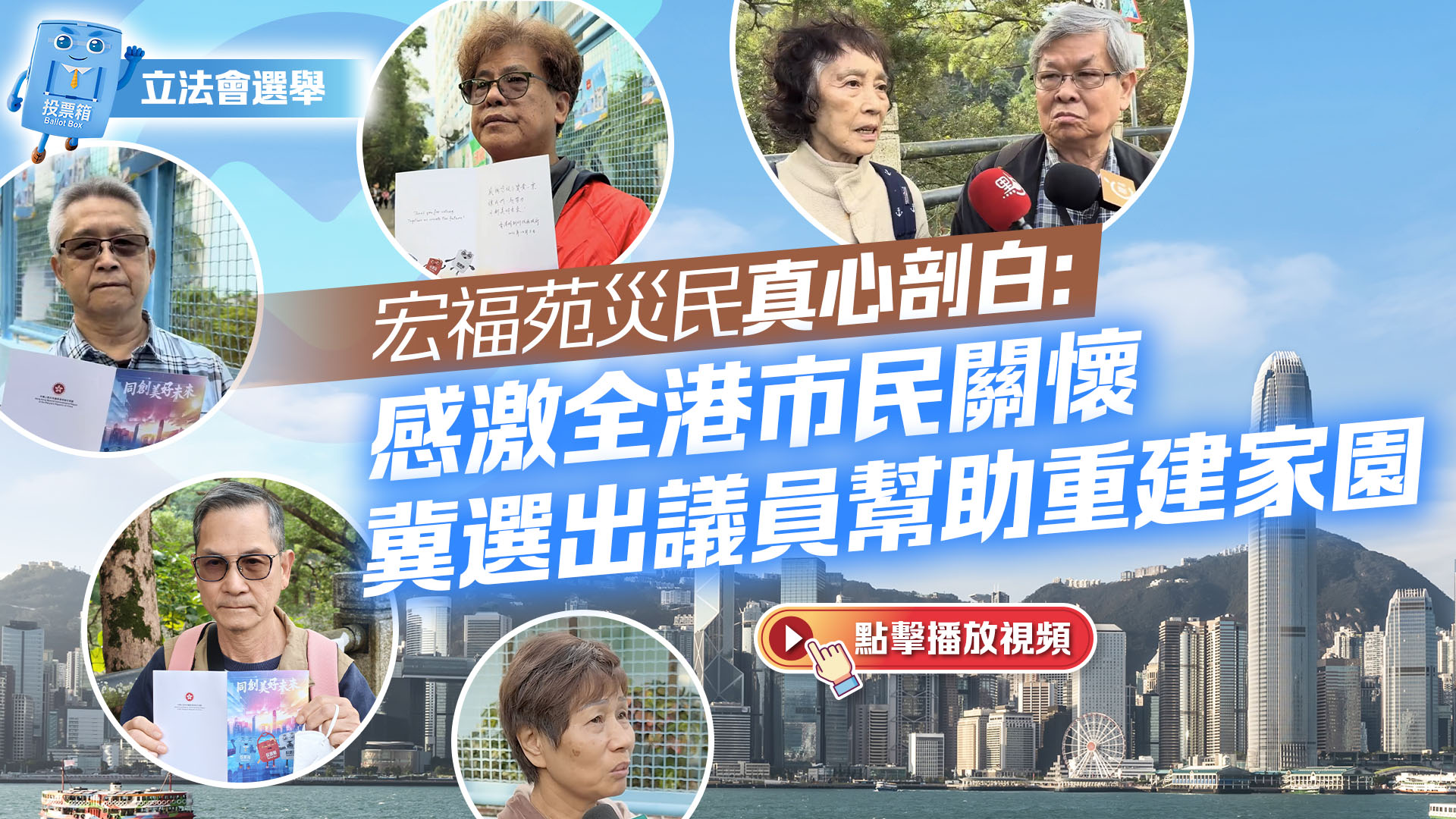 宏福苑宏志閣居民張伯希望立法會新一屆議員幫手,加快讓居民早日重返家園。「我們盡公民責任投票,希望投出議員幫我們重建家園。」多位宏福苑居民都懷抱同一個心願。「宏福苑居民好感激。」