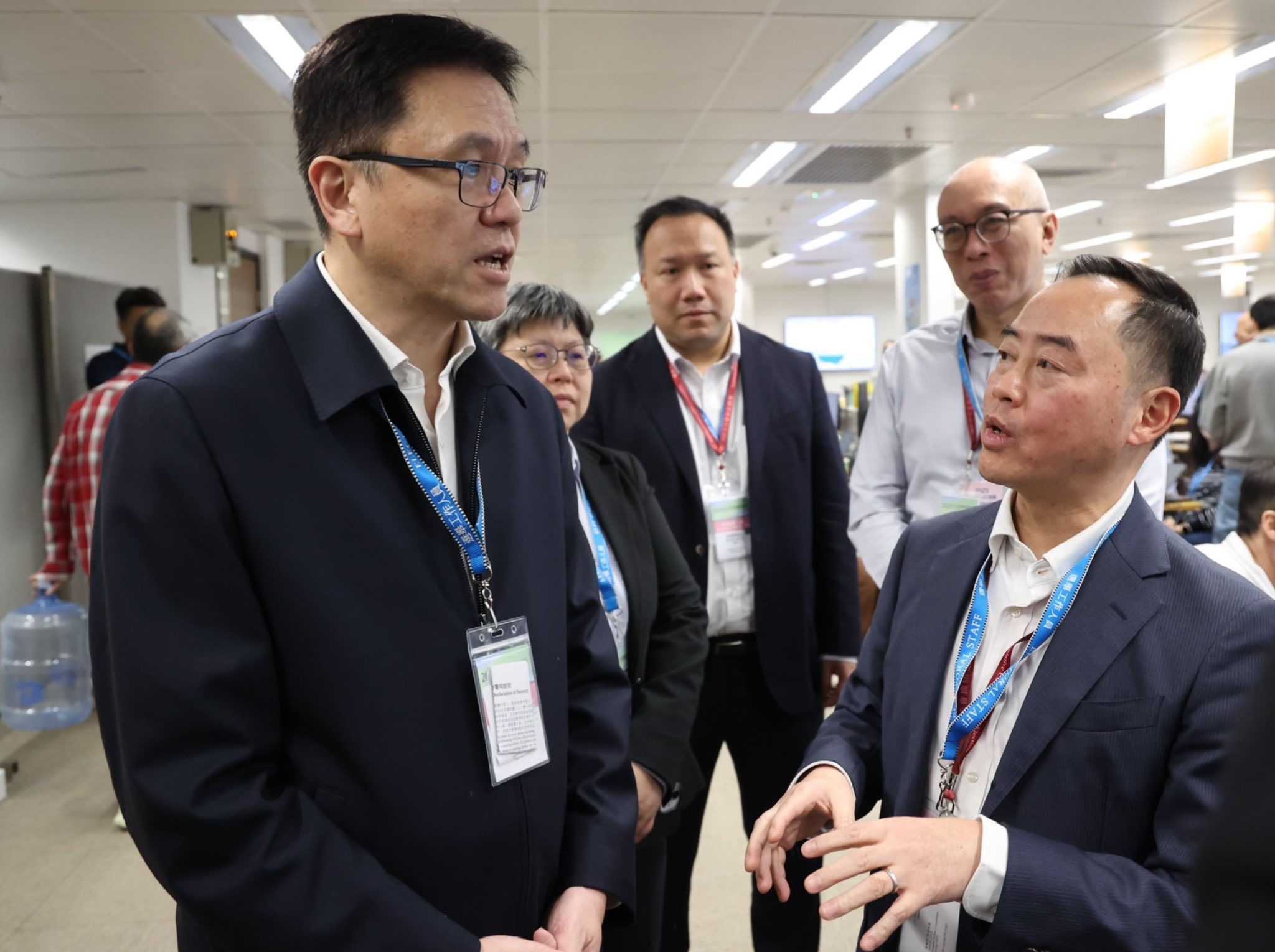 大公文匯全媒體報道,創新科技及工業局局長孫東今日(7日)傍晚視察選舉事務處「中央指揮中心」,聽取數字政策專員黃志光匯報本次立法會換屆選舉的實時系統監察情況。期間,孫東亦與來自數字政策辦公室、選舉事務處、選舉系統和網絡服務承辦商Nexify、華為及香港電訊的技術團隊親切交流,了解各團隊在選舉期間的工作情況。