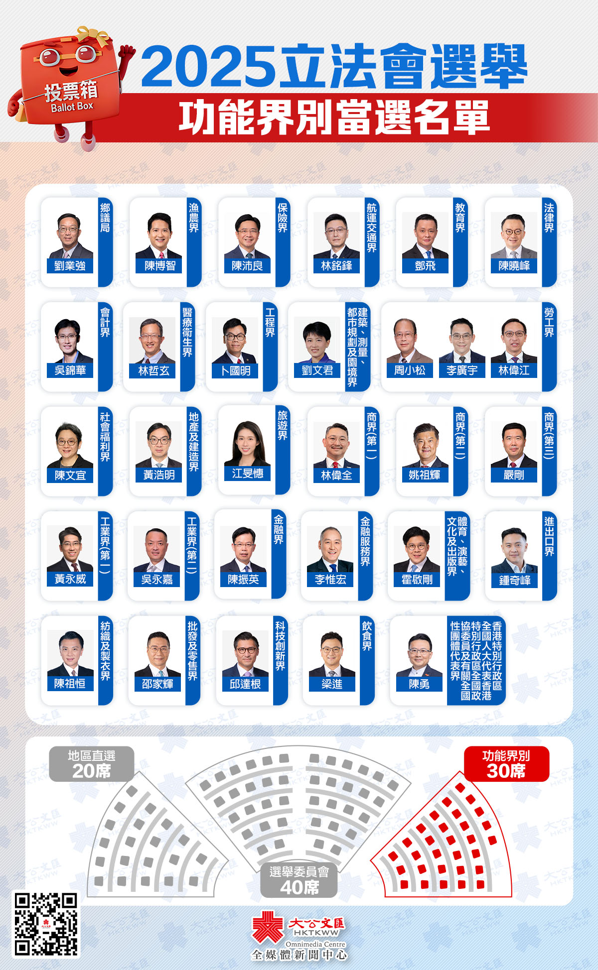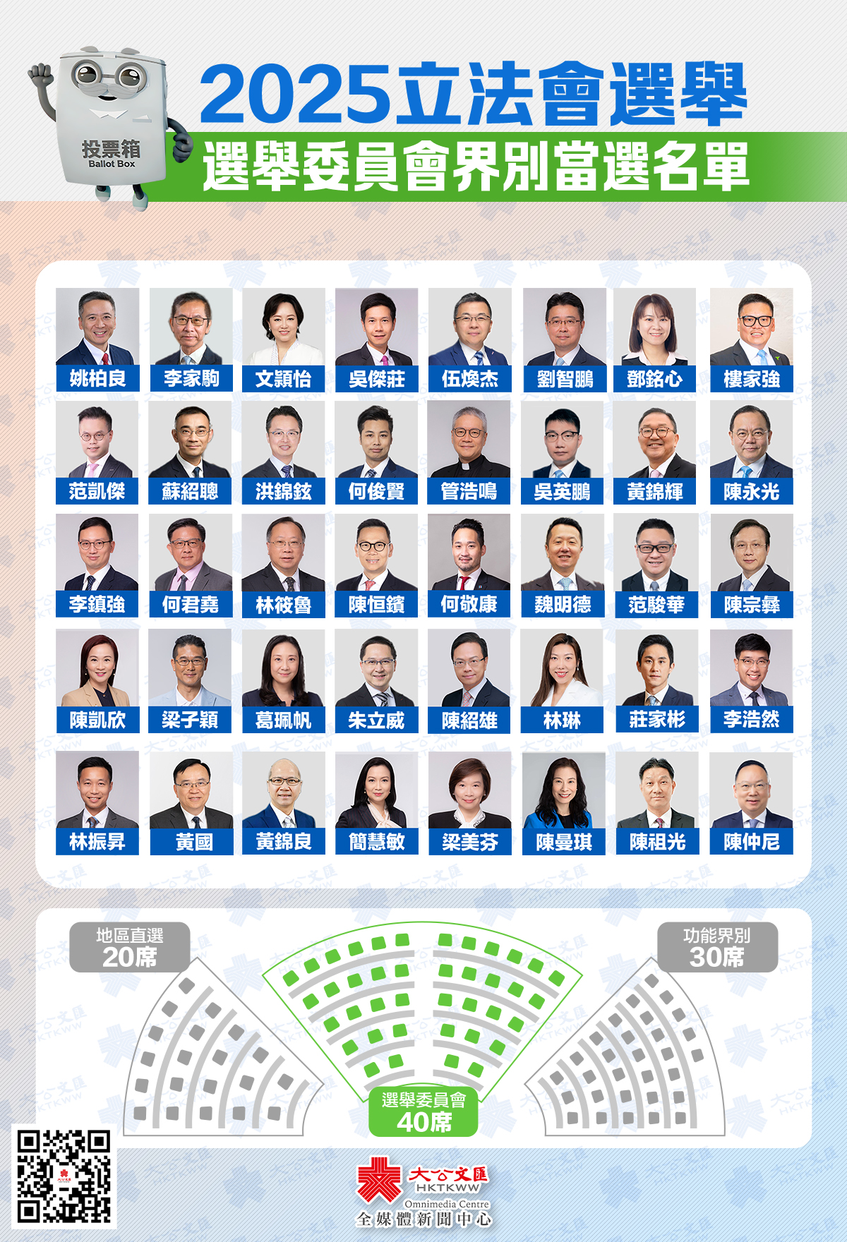 大公文匯全媒體報道,香港特區第八屆立法會選舉於12月7日舉行,新一屆立法會90名議員名單於今早(8日)已經全部出爐,其中有多名現任議員都成功連任,亦有不少新面孔。選舉委員會界別的投票結果,在凌晨1時前最先出爐。40個選委會議席中,有24人是現屆立法會議員成功連任,其餘16人是新面孔。