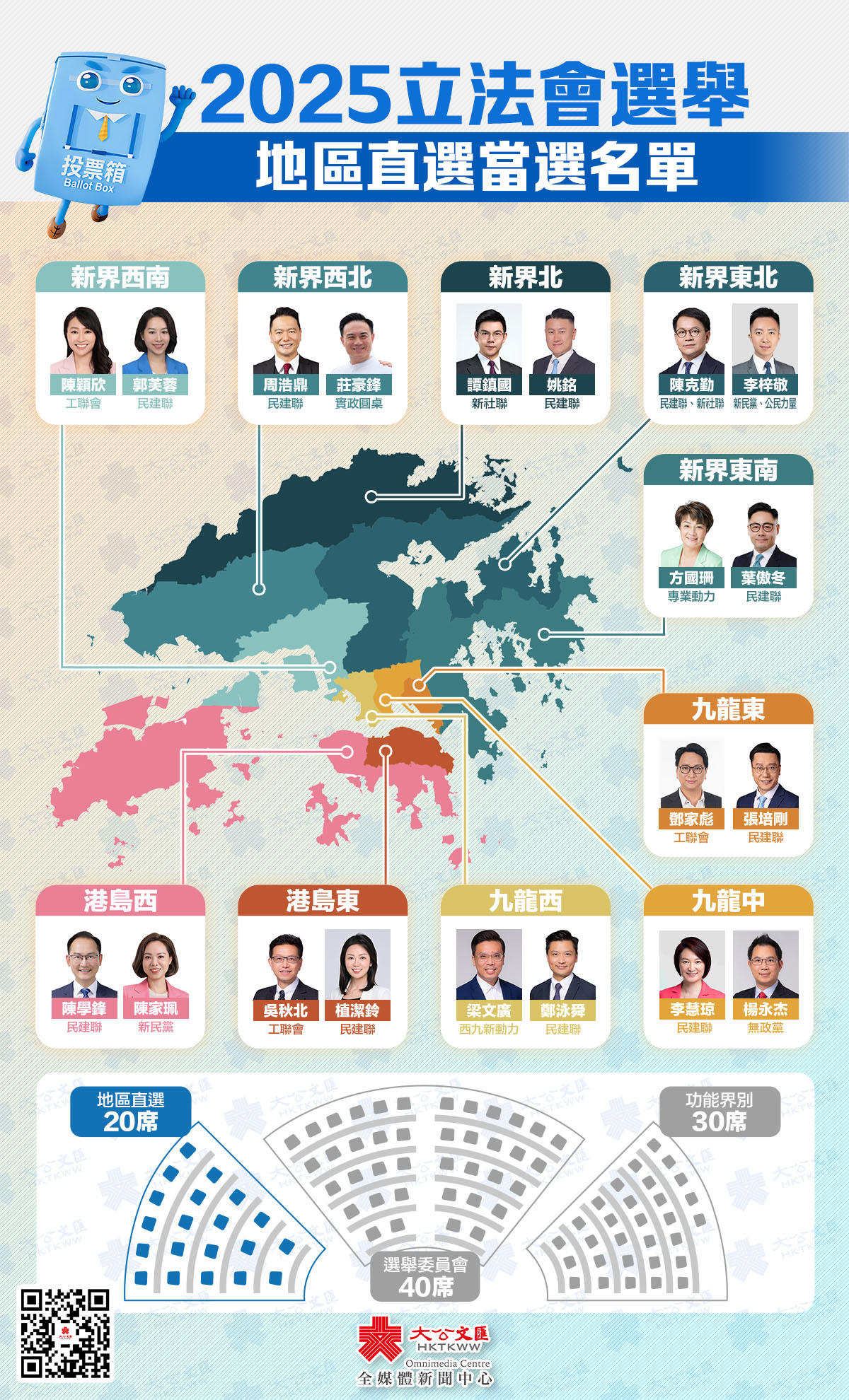 成功連任(24個):姚柏良、吳傑莊、劉智鵬、何俊賢、管浩鳴、黃錦輝、陳永光、李鎮強、何君堯、林筱魯、陳恒鑌、何敬康、陳凱欣、梁子穎、葛珮帆、陳紹雄、林琳、李浩然、林振昇、黃國、簡慧敏、梁美芬、陳曼琪、陳仲尼