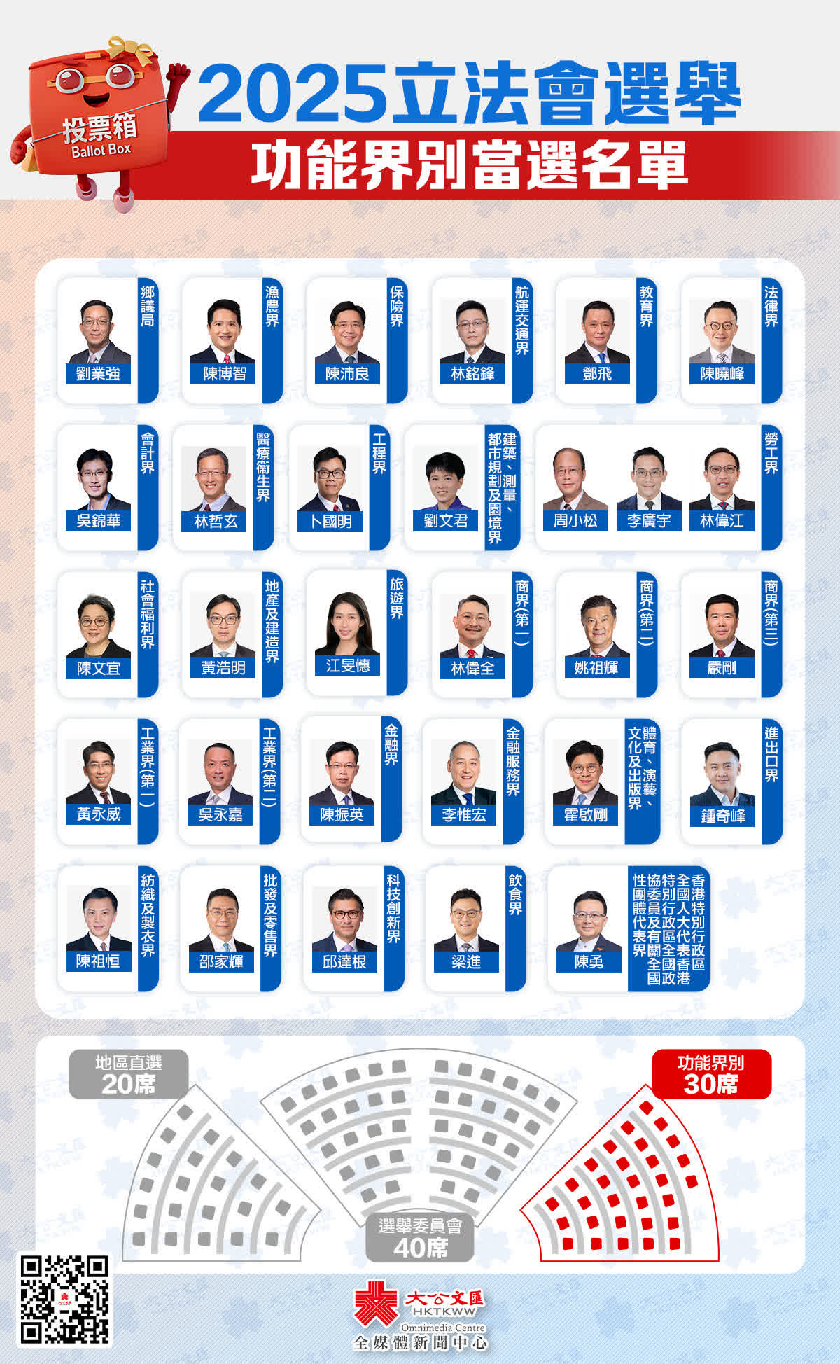 大公文匯全媒體報道,香港特區第八屆立法會選舉於12月7日舉行,新一屆立法會90名議員名單於今早(8日)已經全部出爐,其中有多名現任議員成功連任,亦有不少新面孔產生。當中,功能界別選舉產生30名議員,14名為成功爭取到連任的議員,另誕生了16名新星。