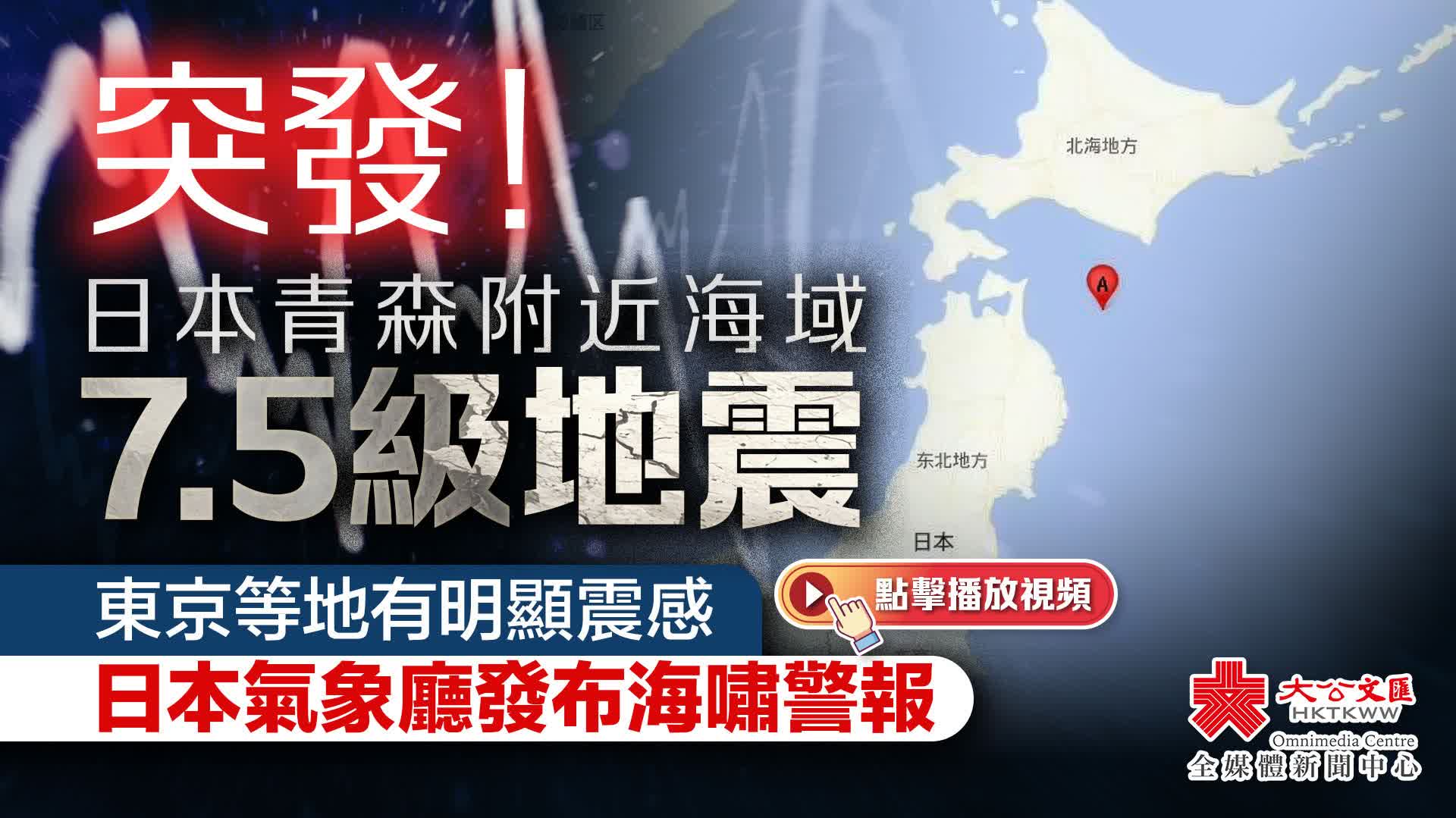 中國地震台網正式測定:12月8日22時15分在日本本州東部附近海域(北緯41.00度,東經142.35度)發生7.5級地震,震源深度50千米。