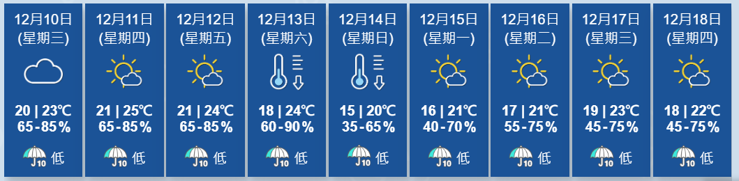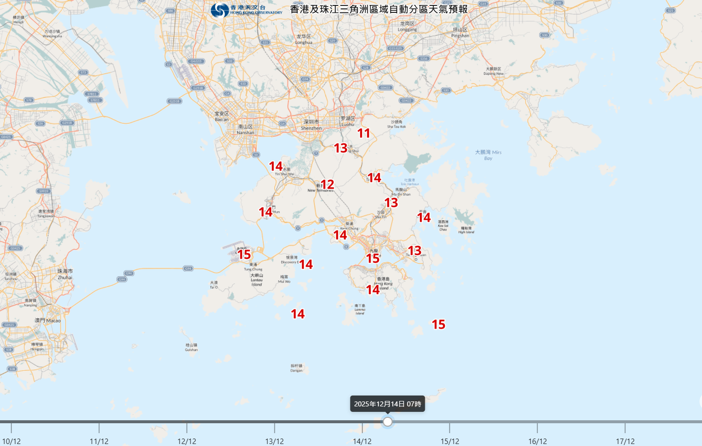 天文台九天天氣預報顯示,本港氣溫將由周六的最高24度,跌至周日(14日)最低15度,氣溫一度驟降9度。據天文台分區天氣預報,周日早上7時,新界東北一帶更低見11度,已達寒冷水平。