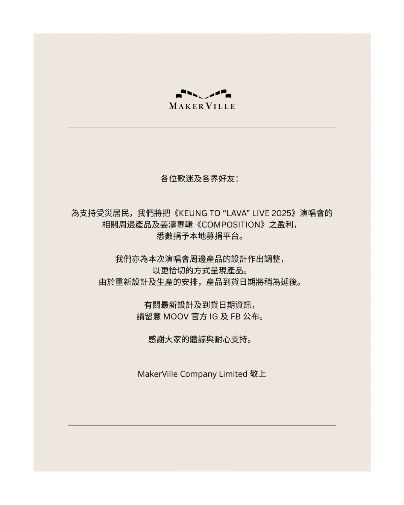 大埔宏福苑早前發生五級大火,姜濤透過慈善機構捐出100萬元助災民,主辦單位MakerVille今日(9日)於社交平台宣布,為支持受災居民,將把《KEUNG TO「LAVA」LIVE 2025》演唱會相關周邊產品,以及姜濤專輯《COMPOSITION》之盈利,悉數捐予本地募捐平台。