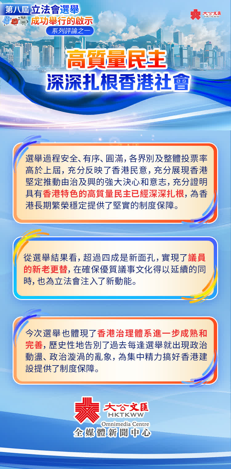 第八屆立法會選舉成功舉行,90位議員順利產生。選舉過程安全、有序、圓滿,各界別及整體投票率高於上屆,充分反映了香港民意,充分展現香港堅定推動由治及興的強大決心和意志,充分證明具有香港特色的高質量民主已經深深扎根,為香港長期繁榮穩定提供了堅實的制度保障。