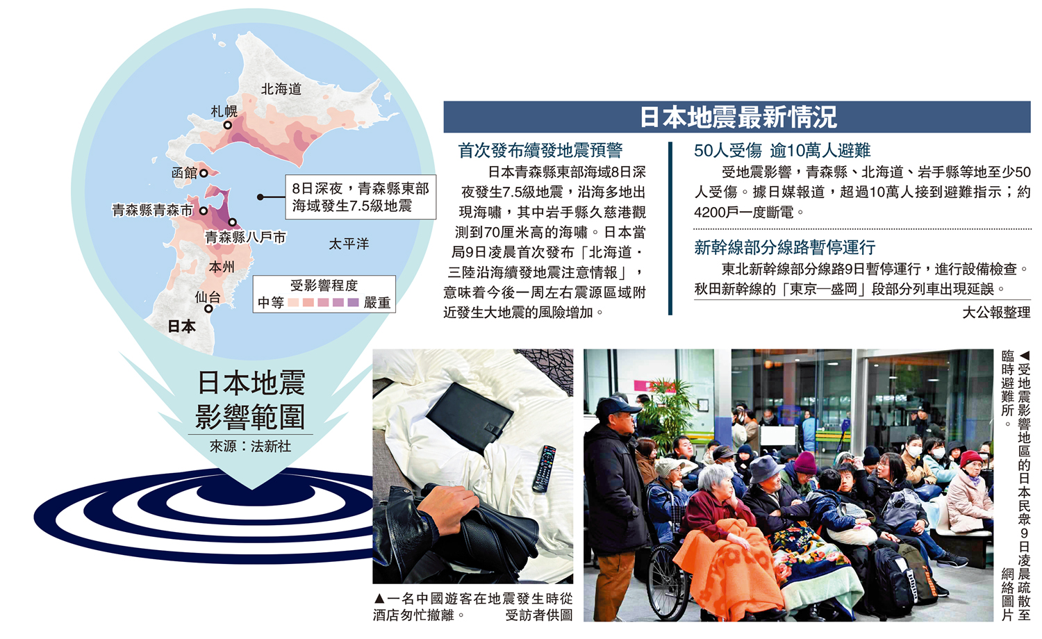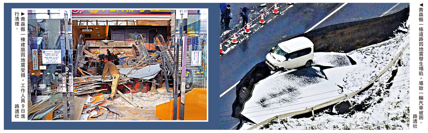 (大公報 記者 桂茹雲)日本青森縣近海8日深夜發生7.5級強震,隨後又發生多次餘震,沿海多地出現海嘯。日本當局9日凌晨首次發布「北海道·三陸沿海續發地震注意情報」,意味着今後一周左右震源區域附近發生8級以上大地震的風險增加。據日媒報道,地震已造成至少50人受傷。中國駐日大使館9日兩度提醒在日同胞注意防災。入境處9日表示,至今未接獲港人求助。一名身在青森的中國遊客告訴大公報記者,地震發生時他感到房子在晃動,急忙從樓梯撤離。