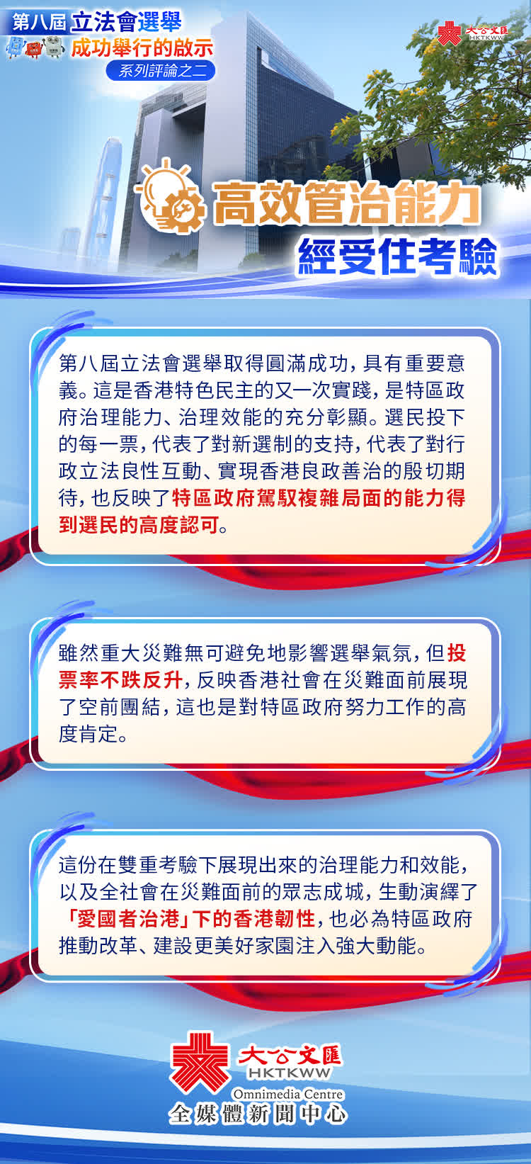 特區政府通過了選舉和救災兩場「大考」,殊為不易,這充分展現了特區政府面對複雜局面的應變和指揮能力,彰顯了「人民至上、生命至上」的施政底色。在選舉和救災這兩道「必答題」面前,特區政府以實際行動表明,治理效能不僅表現在日常工作中,更體現於危難時刻的擔當作為。這份在雙重考驗下展現出來的治理能力和效能,以及全社會在災難面前的眾志成城,生動演繹了「愛國者治港」下的香港韌性,也必為特區政府推動改革、建設更美好家園注入強大動能。