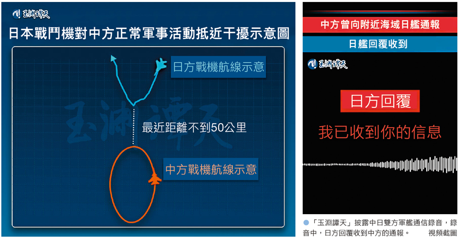 「玉淵譚天」公眾號同日發文,根據遼寧艦航母編隊訓練時間線,還原日方自導自演的拙劣把戲,同時也披露中日雙方軍艦通信錄音,錄音中,日方回覆收到中方的通報。而日方不顧中方反覆提示和預警,多次抵近中國海軍訓練海空域,實證日方有意滋擾中方訓練。