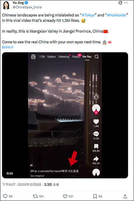 據觀察者網報道,近日,一段關於中國江西上饒望仙谷美景的視頻在外網爆火,但卻被很多賬號錯誤標註為日本「東京」或「北海道」。當地時間12月8日,中國駐印度大使館發言人宇靜在X平台上發帖闢謠:「這段已獲得130萬點讚的熱門視頻中,中國的風景被錯誤地標註為東京和北海道。實際上,這是中國江西的望仙谷。」