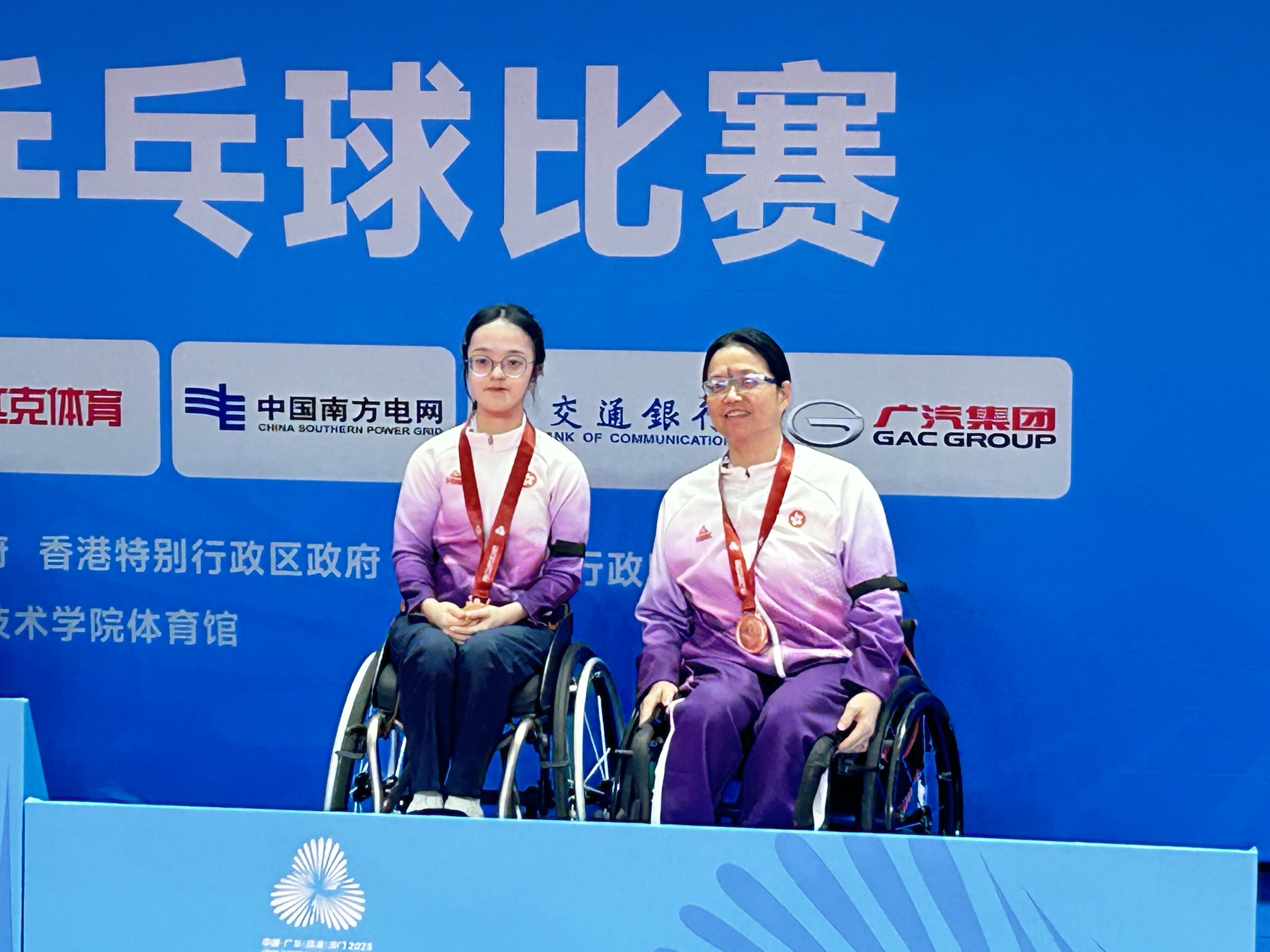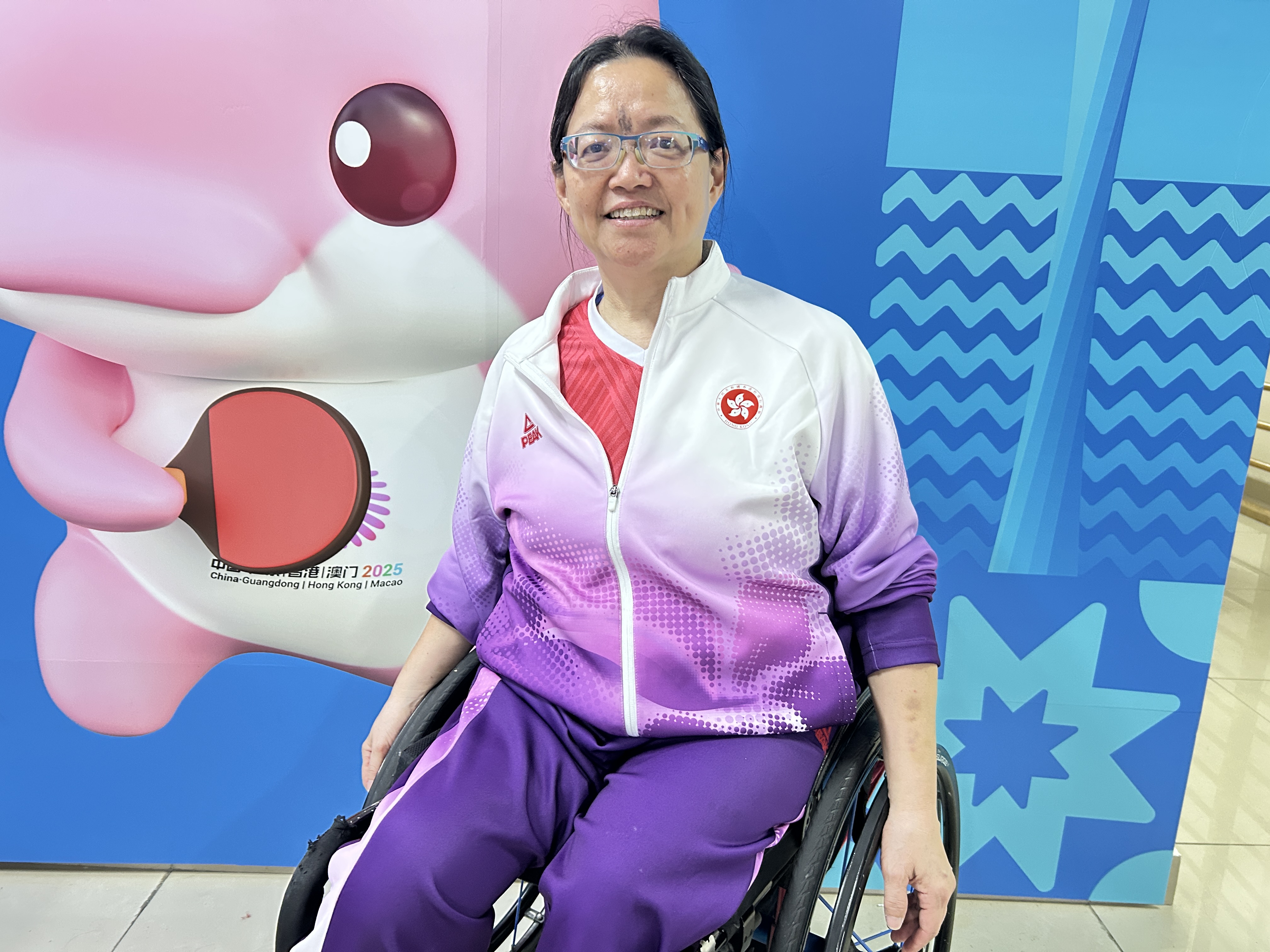 (大公文匯網記者 敖敏輝 廣州報道)在廣州舉行的殘特奧會乒乓球項目比賽中,坐在輪椅上打球的64歲香港運動員黃佩儀備受關注。9日下午,在TT5女子雙打比賽中,她和年輕的隊友袁泳琪搭檔,以3:0戰勝青海組合,奪得一枚寶貴的銅牌。這是她第一次參加全國殘特奧會,也是賽會第一枚獎牌。作為一名港隊老將,她參加了8屆奧運會(殘奧)的比賽,代表香港征戰無數個國內外大型賽事,獲得奧運會1金2銀、世錦賽1金的彪炳戰績,足以讓她在香港體育發展史冊上留下濃墨重彩的一筆。