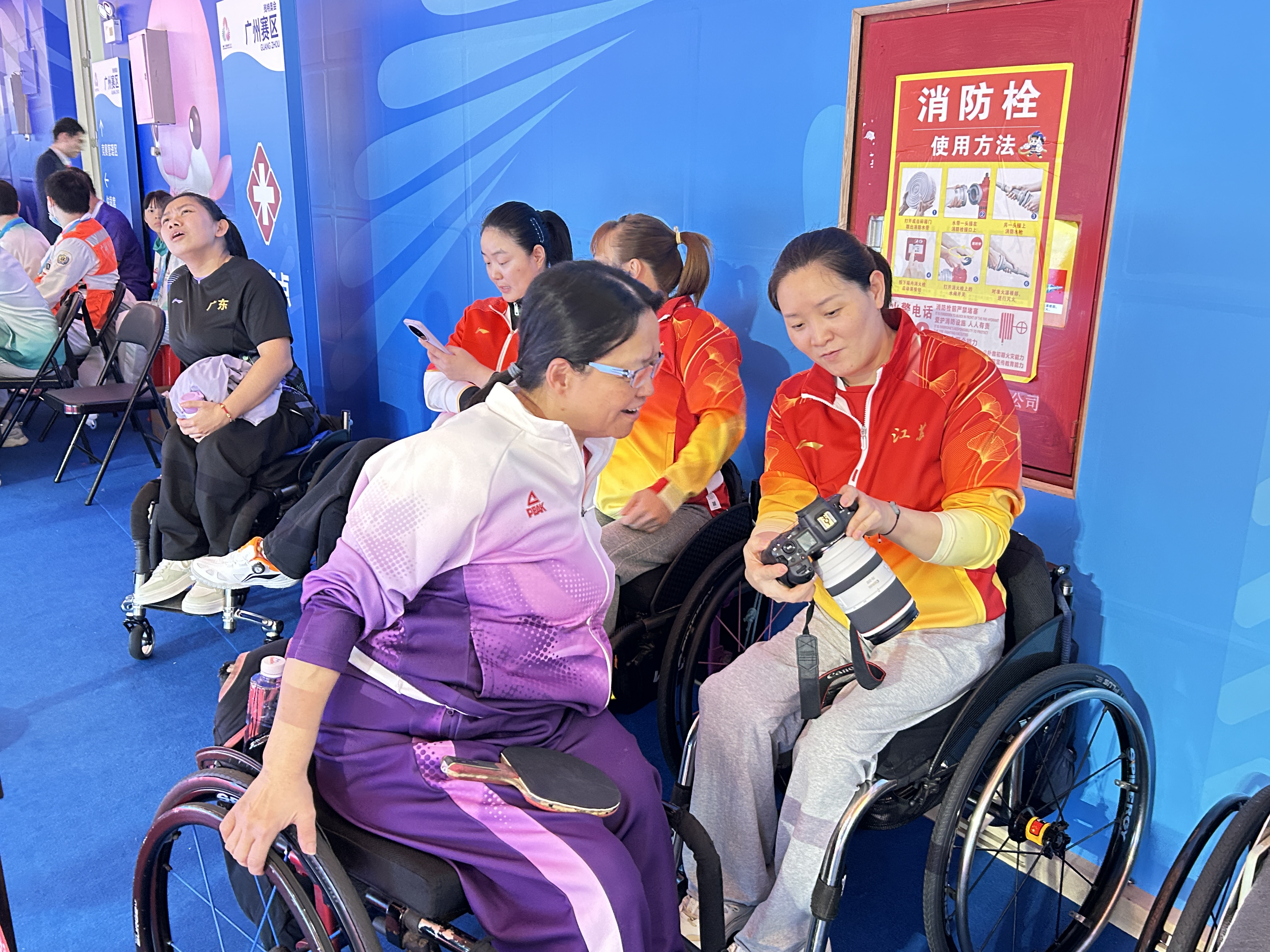 賽場之外,本屆殘特奧會對黃佩儀而言更像一場老友重逢的聚會。過去數十年,她曾多次前往江蘇、陝西等地集訓,與大批內地殘疾人乒乓球運動員、教練員結下深厚情誼。在9日的比賽間隙,江蘇籍奧運冠軍張變剛剛結束自己的賽事,便拿起相機為黃佩儀記錄賽場瞬間,賽後二人還湊在一起對着照片細細回味。得知12月11日黃佩儀要出戰單打比賽,張變還主動和她交流打法,貼心提示比賽中需要注意的細節。