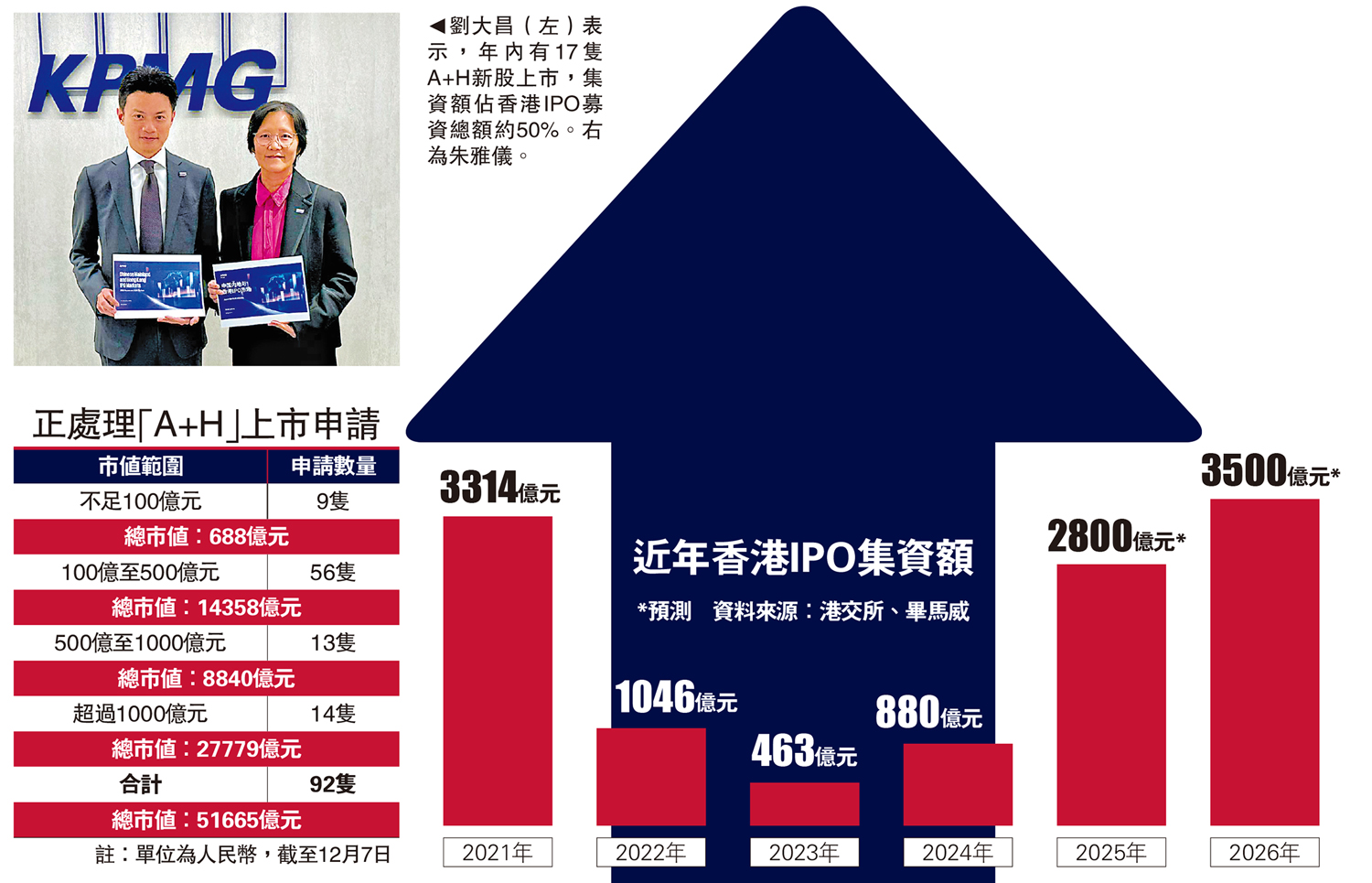 (大公報 記者 蔣去悄)香港新股市場重拾動力。會計師行畢馬威預計,今年香港IPO集資規模有望超過2800億元,位居全球首位,明年有望進一步增至3500億元,保持三甲之列。畢馬威中國香港資本市場組主管合夥人劉大昌表示,目前有92隻「A+H」新股正排隊等待上市,總市值近5.2萬億元人民幣(約5.7萬億港元),大部分有望在2026年完成發行,繼續為市場注入動力。