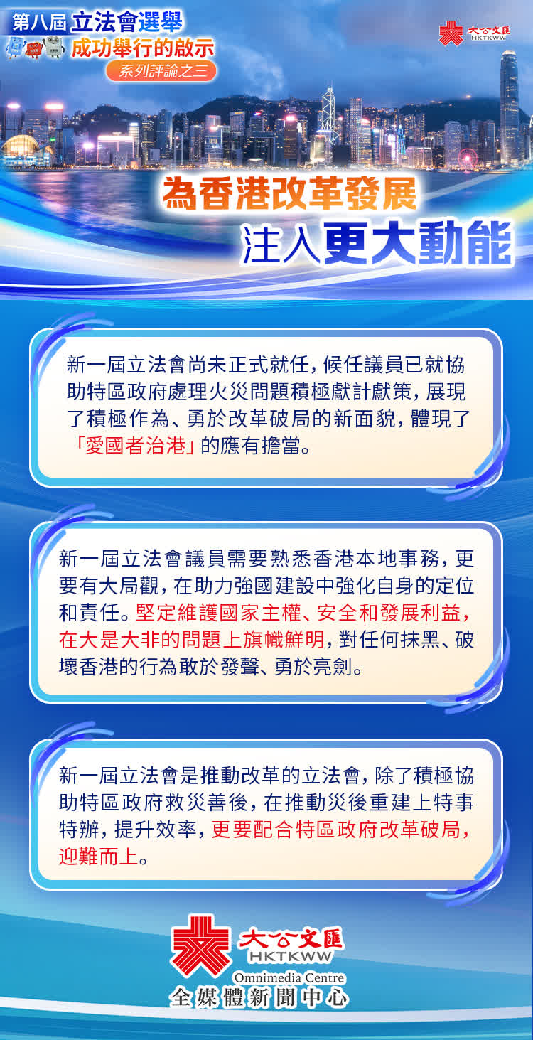 今次宏福苑火災釀成了香港數十年來最慘痛的災難,暴露了舊樓管理和維修方面的不少制度性漏洞。特區政府宣布將成立由法官主持的獨立委員會在制度層面深刻檢討,並將提出改革建議。改革從來不是一件容易的事,必然觸碰既得利益,必然會遭遇阻力。行政長官李家超早前呼籲選民投下推動改革的關鍵一票,意味深長。新一屆立法會是推動改革的立法會,除了積極協助特區政府救災善後,在推動災後重建上特事特辦,提升效率,更要配合特區政府改革破局,迎難而上。唯有打破既得利益的藩籬,讓每一個階層都能公平地分享經濟發展的成果,才能為香港構築起長治久安的安全網。