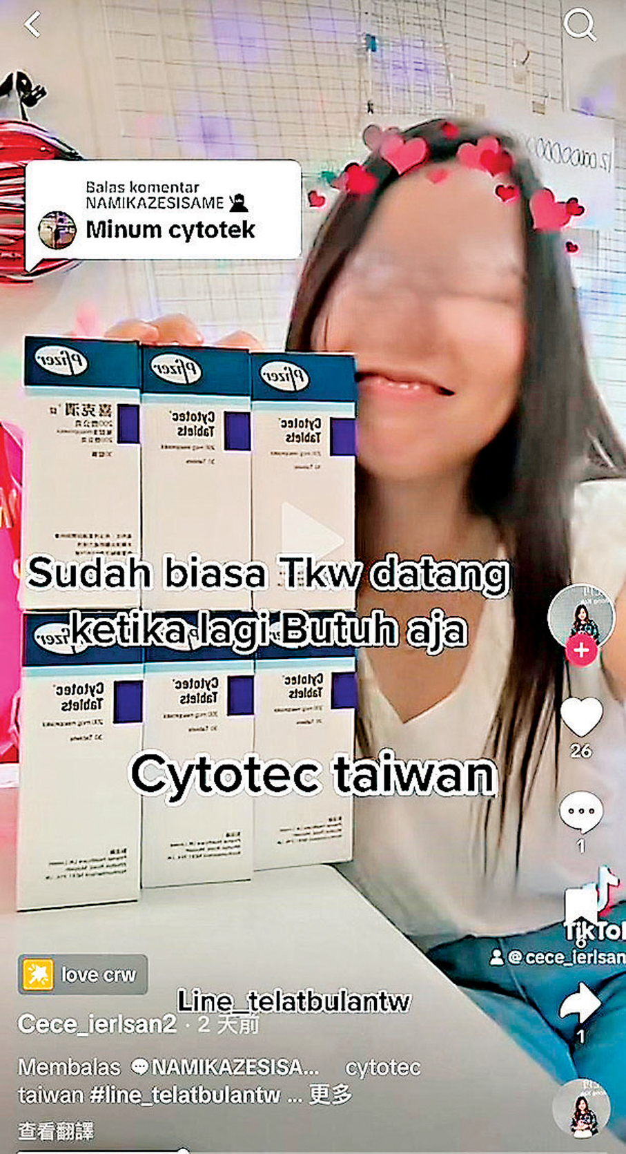 為直擊墮胎藥的售賣黑幕,記者潛入社交媒體平台,發現一位聲稱來自台北、名叫Eka Rahma Wati的印尼女子,頻頻在社交平台發帖,聲稱手上擁有大批可供墮胎的西藥「CYTOTEC」。在其發放的片段中可見,她將逾百盒「CYTOTEC」堆成一座小山,邊拍邊自話自說:「又有好多客人訂貨了,這幾天都在忙於寄貨。」說畢,她上載幾張寄貨相及片段。她在片中巧妙地將藥物用多層黑色膠袋包裹,驟看會令人以為只是普通貨件。