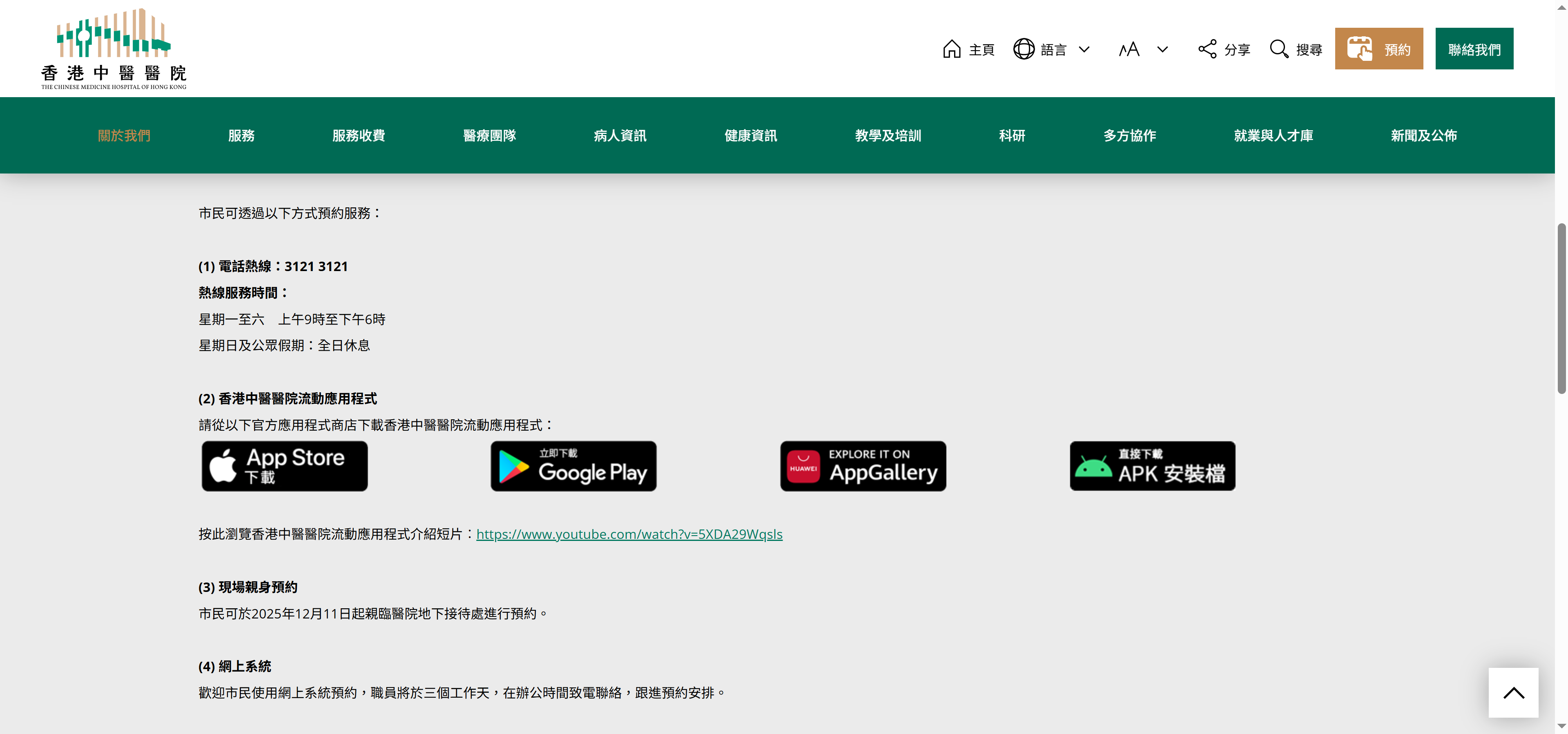 預約制度方面,卞兆祥指,醫院有4種預約渠道,包括可透過電話31213121預約、經中醫醫院網站登記、下載香港中醫醫院應用程式(CMHHK Mobile App)預約,還可以親身前往醫院預約。